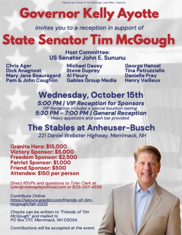Don't miss Sen. McGough's reception in Merrimack with Special Guest Governor Kelly Ayotte! Details below.
