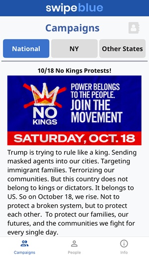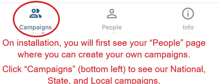 Click "Campaigns" at the bottom left as circled in the image above. You will see our 10/18 No Kings Protests campaign at the top. Click the image to see all of your Democratic friends across the USA.