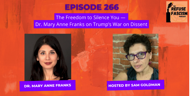 Episode 266 dropped October 5: Host Sam Goldman speaks with Dr. Mary Anne Franks, George Washington University professor and author of Fearless Speech: Breaking Free from the First Amendment, about what Trump and MAGA mean by “free speech” as they directly censor critics.