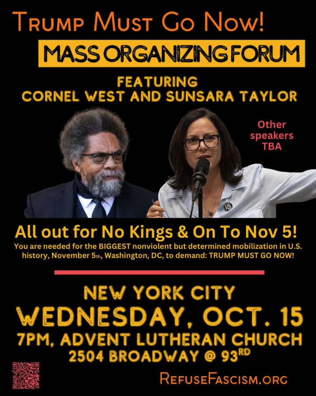 This poster campaign and billboard truck will seize attention, spark media coverage, and saturate society with the message of November 5. They will put the truth — and the way forward — directly in front of people where they live, work, commute, study, and gather. Your donation of $50, $100, $250, $1,000 or more will put this historic call in front of millions — in the streets, in the press, and on social feeds. Donate now to make the November 5 mobilization what everyone is talking about.