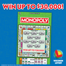Introducing the MONOPOLYTM scratch ticket with three top prizes of $30,000.