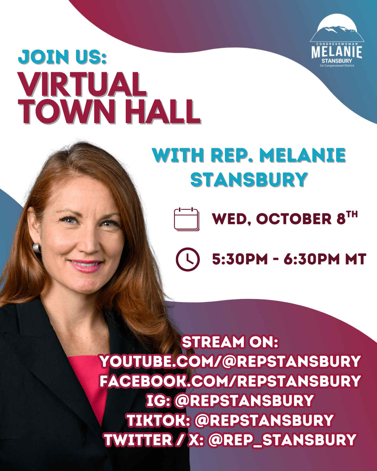 With the shutdown happening, I am in D.C. fighting for a bipartisan solution to reopen the government, protect healthcare, and address the needs of our community I'm hosting a virtual Town Hall TOMORROW, October 8th, at 5:30 pm MT to hear directly from you. I'll be streaming on YouTube, Facebook, Instagram, TikTok, and Twitter/X. Join me! | It is an honor to represent you in Congress. As always, if I can assist you or your family, please do not hesitate to reach out to our District Office at (505) 346–6781! If you’d like to keep up to date on what I am working on in Washington, D.C., you can subscribe to our newsletter here and follow me on Facebook, Instagram, X, Threads, Bluesky, YouTube, Substack, and TikTok. | Rep. Melanie Stansbury Member of Congress | Sign up for my newsletter to get updates on this issue and others! | Washington, D.C. Office 1421 Longworth House Office Building (202) 225-6316 | Albuquerque Office 6301 Indian School Rd NE Suite 420 Albuquerque, NM 87110 (505) 346-6781 | |