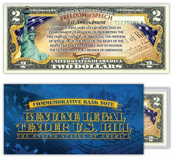 Celebrate one of America’s most cherished rights with this stunning 1st Amendment “Freedom of Speech” $2 Bill.