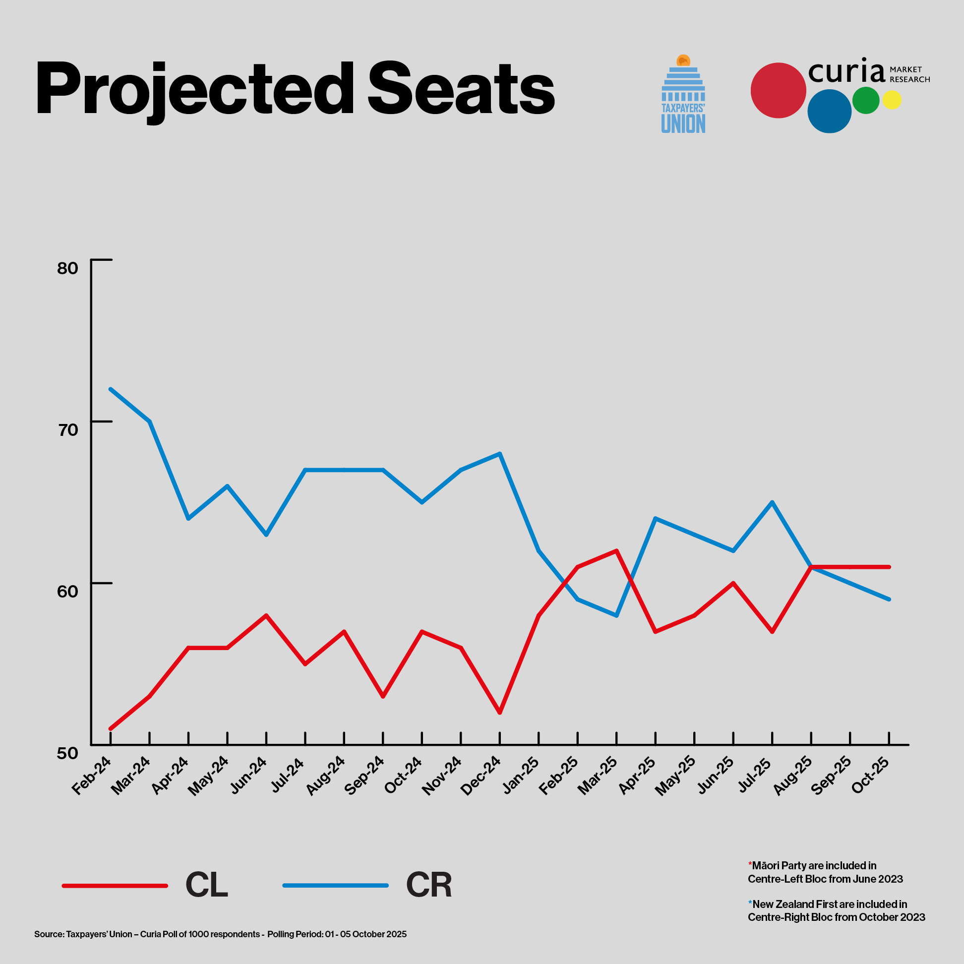 (up three), ACT eight (no change), and Te Pāti Māori six seats (no