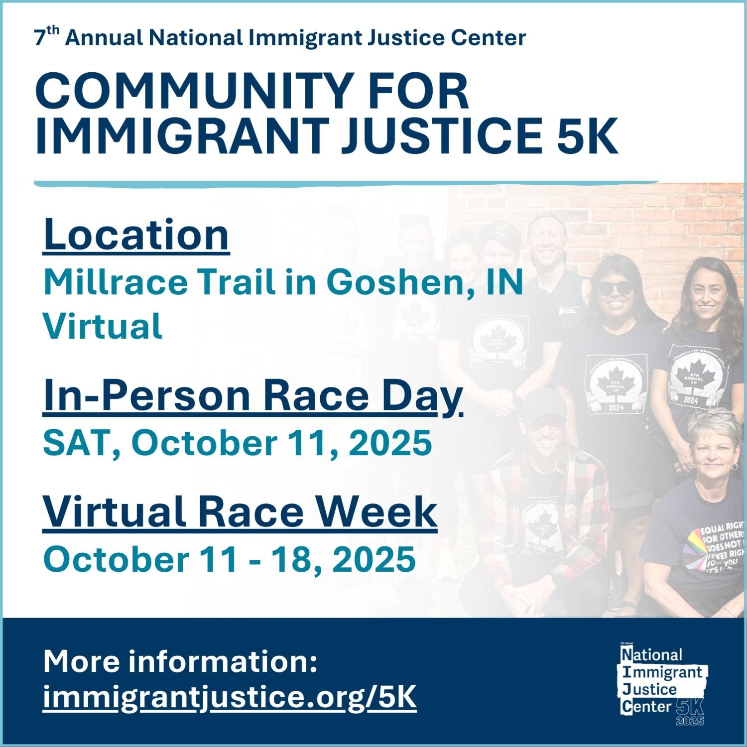 | | Last chance to RSVP for the 7th Annual 5K for Immigrant Justice Event Information Race Day Saturday, October 11, 2025 11:00 – 2:00 p.m. EDT In-person in Goshen, IN Virtual Race Week Saturday, October 11 – Saturday, October 18, 2025 Race week kicks off THIS SATURDAY, October 11! Join us for the 7th Annual NIJC Community for Immigrant Justice 5K in person in Goshen, Indiana or virtually. For seven years, this event has brought together runners, walkers, and supporters nationwide to champion immigrant rights and raise critical funds for legal services that keep families together. You can join us in person in Indiana or participate virtually from your own neighborhood. We can’t wait to see you at this year’s race! Register here. |