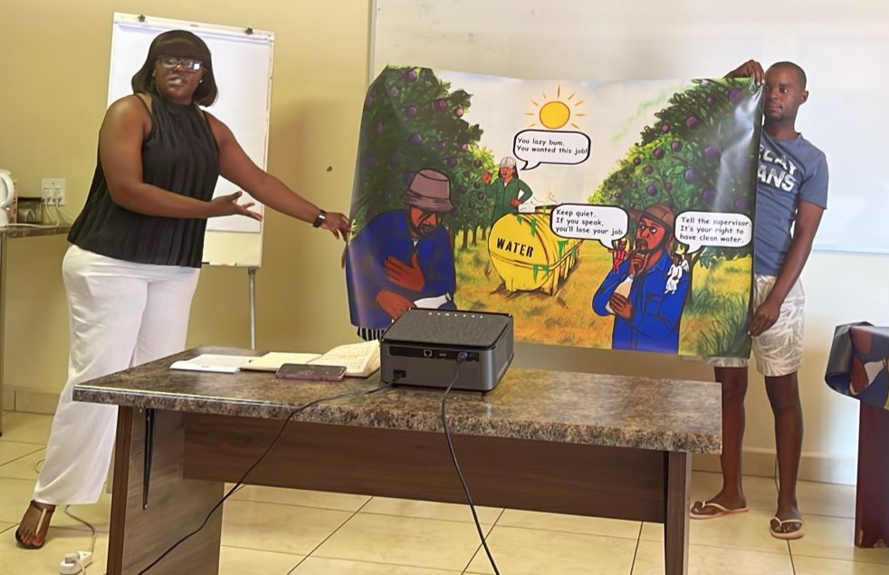Because many farmworkers’ initial contact with the Fair Food Program occurs in this discussion centered around a drawing, much of the recent training worksop focused on sharing this crucial education technology at the heart of the FFP’s success. First, in the weeks ahead of the workshop, the FFP teams from the US and South Africa collaborated to create a new education drawing about safe drinking water (above). Then, when it was finally time for the workshop itself to begin, the CIW education team spoke with their South African counterparts across the globe via Zoom in an animated discussion about their use of Popular Education and the best practices they’ve developed over the years, including tips on how to draw out the workers’ own experience with the issue through guided discussion, and how to always bring the conversation back from the lived experience in the fields to the rights in the FFP’s code of conduct. The team of educators in South Africa also had an opportunity to practice leading education sessions (below) to further hone the presentation for the South African context, with feedback from Immokalee.