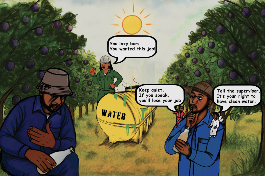 An illustration created specifically for the FFP in South Africa, designed by local artists and farm labor rights experts with input from workers themselves. The illustration is intended to help inform workers of their right to protect themselves from heat stress — and to have clean water at work — without fear of retaliation. While this version is in English, the FFP South Africa team carries Xhosa, Afrikaans, Sesotho, and Setswana versions with them to each education session in order to work in the language each worker’s primary language, and the drawing is designed with the goal that its message be understood even without the words as literacy levels vary across crews as well.