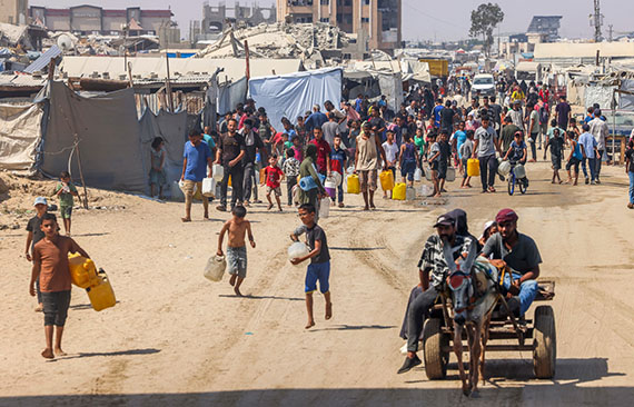 Heavily damaged wells and infrastructure have caused a severe water crisis. Palestinians rush to fill jugs of drinking water from a water truck in southern Gaza.