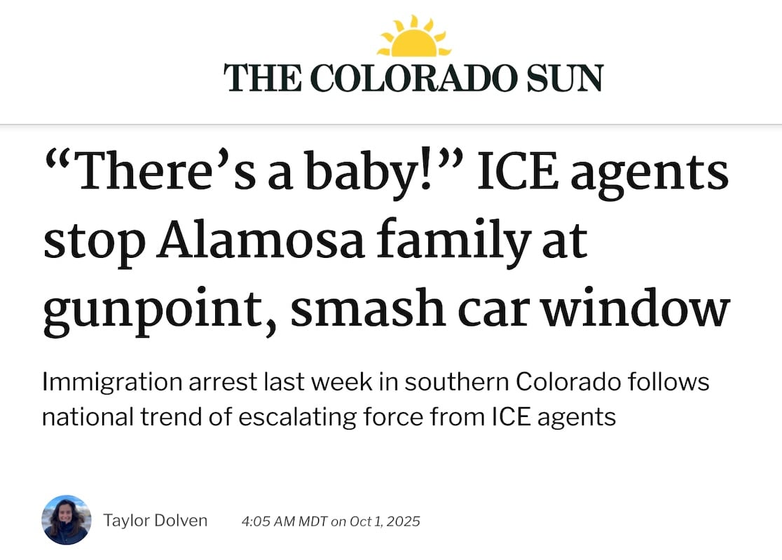 Last week in Alamosa, Colorado, ICE agents surrounded a car leaving the Alamosa County Courthouse to arrest the man driving the car. In the backseat was his wife and their 1-month old newborn baby.