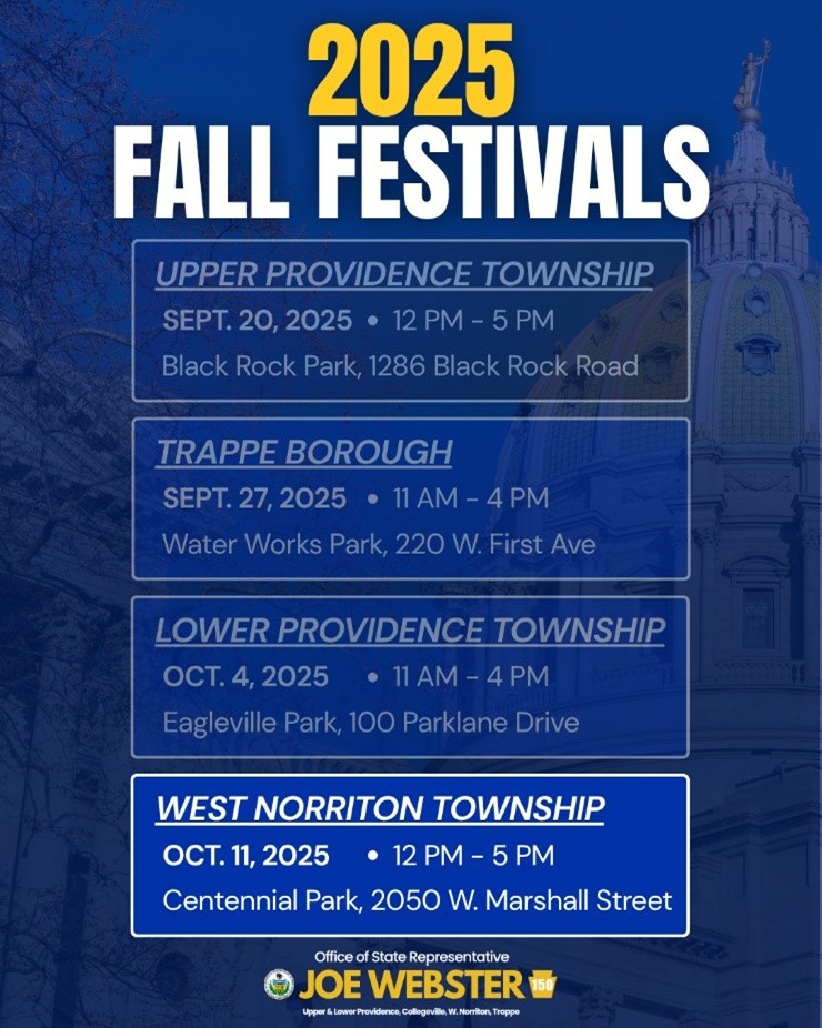 There is no cost to participate but all vendors must apply and be approved. For more information, reach out to Nicole at [email protected] | Heads up! My district office will be closing on Monday, October 13, in observance of Indigenous Peoples’ Day. We will re-open on Tuesday, October 14, at 9:30 a.m. If you need any state-related assistance, please call 484-200-8263 or email [email protected] and a member of my staff will contact you. | Are you registered to vote? 🗳️ Pennsylvania voters have until Monday, October 20, to register and be ready to vote in the Municipal Election occurring on Tuesday, November 4! Don’t miss your chance to make your voice heard. Register now at vote.pa.gov/Register | West Norriton Pedestrian Improvements | I want to offer my congratulations to West Norriton Township for receiving a $156k grant from the Montco 2040 Implementation Grant Program, which supports local projects that connect communities, develop sustainable places and foster a vibrant economy. West Norriton resident Sean Golas identified the need for pedestrian safety improvements along Boulevard of the Generals and presented the proposal to the West Norriton Township Board of Commissioners. With the grant money, the township plans to install ADA compliant curb ramps, a bus shelter and landing area for the nearby SEPTA Route 131 bus stop, a crosswalk and a median island. Thank you to Sean and to West Norriton for advocating for these improvements that make our community a safer place to travel! You can read more here | Construction at Crawford Rd/Eagleville Rd/Park Ave Intersection | After receiving questions about the construction at the intersection of Crawford Rd/Eagleville Road/Park Avenue in Lower Providence, I have a timeline update. Currently, water relocation will begin in November/December, then sanitary sewer relocation in January/February and road construction in March/April. Lane restrictions may take place during this time period, but detours are not expected during the utility work. As always, please remain vigilant when crews begin working for your safety as well as for the safety of the road workers. | America250 Check Presentations | On Monday, Michael represented our office at the America 250PA check presentations for Historic Trappe and Friends of Valley Forge (Valley Forge Park Alliance). These grants will help support projects in preparation for the 250th anniversary of the United States. Historic Trappe received $20,000 to help with the continued restoration efforts of The Speaker’s House, and Friends of Valley Forge received $10,000 to assist with Valley Forge 250 festivities. Congratulations! Pictured: Molly Duffy from Valley Forge Park Alliance, Cassandra Coleman from America250PA, Sara from Senator Amanda Cappelletti’s staff, Lisa Minardi from Historic Trappe, Emily Sneff from Historic Trappe and Keith McLennan | My staff had a great time at the ribbon-cutting for Baked Bouquet, a new business in Trappe that turns cupcakes into edible bouquet arrangements! Our communities thrive when we welcome new businesses, and I’m glad that Baked Bouquet is now a part of ours! | Fall Festivals in the 150th Legislative District wrap up this Saturday, October 11, with West Norriton’s Fall Festival! Make sure you stop by my booth this Saturday and say hello to my staff at Centennial Park from 12 p.m. to 5 p.m. West Norriton Annual Fall Festival Saturday, October 11, from 12 p.m. - 5 p.m. Centennial Park, 2050 W. Marshall Street, Jeffersonville, PA | Collegeville Parks Master Plan | Collegeville Borough and the Montgomery County Planning Commission will be hosting an open house on tonight, Oct. 8, between 6 p.m. and 8 p.m. at Collegeville Fire Company (29 E. 5th Avenue, Collegeville, PA). The meeting will discuss Collegeville Borough’s parks and open spaces while allowing for community suggestions on improvements to Collegeville Community Park, Water Works Park, Hunsberger Woods and Creekside Park. | Wills, Deeds & Peace of Mind | Tomorrow, Oct. 9, Montgomery County Coroner Dr. Janine Darby, Recorder of Deeds Jeanne Sorg and Register of Wills Tina Lawson Esq. are coming together to bring you Wills, Deeds and Peace of Mind, an event designed to help you plan for the future and navigating an unexpected life event. Join them at the Montgomery County Coroner’s Office (56 Eagleville Rd, Eagleville, PA) from 5:30 p.m. to 7 p.m.! You can register by clicking here. | Montgomery County Resource Expo | On Wednesday, Oct. 15, the Montgomery County Intermediate Unit will be hosting the Montgomery County Resource Expo from 6 p.m. to 8 p.m. at 2 W. Lafayette Street, Norristown, PA. This event will have a range of resources and services to support individuals with disabilities and their families, including postsecondary opportunities, advocacy support, mental health services, transportation and more. You can register by visiting this link: learn.mciu.org/mcre25 | If you’re a senior 65 or older, you can ride SEPTA for free! Stop by my district office at 35 Evansburg Road with a valid form of ID and my staff can help you sign up for a free SEPTA Senior Fare Card. My office hours are Monday through Friday, 9:30 a.m. to 4:30 p.m. | If you need state-related assistance, my office can help you! Please feel free to contact my staff with any questions by calling 484-200-8263 or emailing [email protected] | Indigenous Peoples’ Day – Oct. 13 | This upcoming Monday, October 13, we celebrate Indigenous Peoples’ Day. We take this day to not only recognize the contributions the Indigenous peoples of America have made throughout history, such as pain relievers, kayaks and lacrosse, but we also honor their culture. It’s also important to acknowledge their perseverance as a people while they faced unimaginable persecution. In this reflection, we need to support a future that’s accepting and unites us all, not one that divides and pins us against each other. As a reminder, my office will 