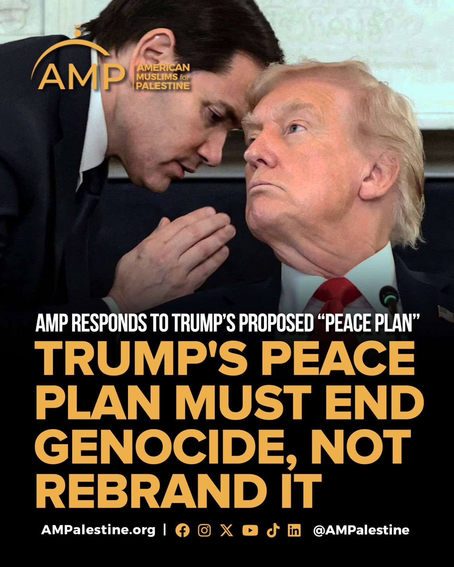 Trump's Peace Plan Must End Genocide, Not Rebrand It Dear Email, American Muslims for Palestine (AMP) cautiously welcomes President Trump’s announcement of an agreement between Hamas and Israel on the first phase of a proposed “peace plan.” However, we remain deeply concerned about Israel’s tactics and the deceptive maneuvers of Prime Minister Benjamin Netanyahu, whose government repeatedly signals that its sole priority is the return of Israeli prisoners—followed by a resumption of genocidal warfare in Gaza. This skepticism is well-founded. Israel previously reneged on a U.S.-brokered agreement reached in January under the Biden administration, with support from then-President-elect Trump. That agreement outlined three phases leading to a permanent ceasefire. Yet Netanyahu withdrew from the deal at the end of the first phase in early March and resumed brutal military operations in Gaza, including a systematic campaign of starvation targeting hundreds of thousands of Palestinians. AMP emphasizes that the core issue is not prisoner exchange—it is the urgent need for a permanent end to the genocide. We assert the following principles: - The final agreement must include a complete and unconditional Israeli withdrawal from Gaza, without delay or obstruction.