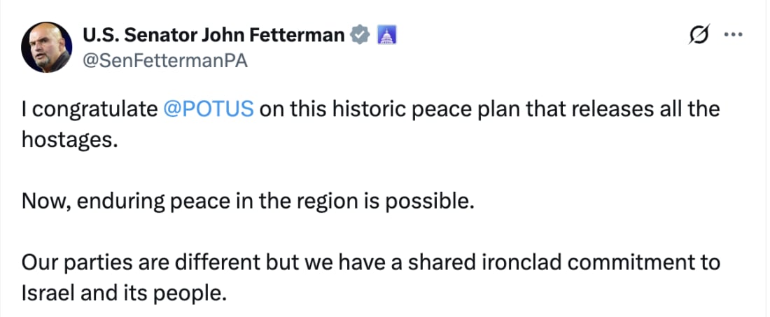 Democratic Sen. John Fetterman praised President Donald Trump after Hamas and Israel agreed to phase one of a peace plan, stating they share an “ironclad commitment to Israel and its people” despite being from different parties.