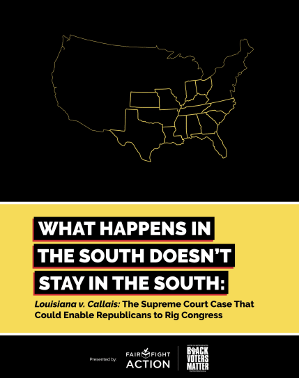 Yesterday, Fair Fight Action and Black Voters Matter Fund released a new report detailing the stakes of Louisiana v. Callais, a case the U.S. Supreme Court will rehear on October 15 that centers on Section 2 of the Voting Rights Act – the central safeguard against racially discriminatory redistricting. Combined with Republicans’ gerrymandering power grab, a ruling striking down Section 2 could help secure an additional 27 safe U.S. House seats for Republicans when compared to the 2024 House maps – at least 19 directly tied to the loss of Section 2 of the Voting Rights Act (VRA). It’s enough to cement one-party control of the U.S. House for at least a generation. The new report underscores that the Court’s rehearing is an extraordinary step just months after the case was first argued, and there are credible indicators the far-right majority may be preparing to reshape voting rights in America by striking down Section 2 of the VRA. The Court will examine whether Louisiana’s court-ordered creation of a second majority-Black congressional district, drawn to fix a proven VRA violation, is unconstitutional due to its consideration of race. Essentially, the justices will decide if considering race to address proven racial discrimination in electoral maps can itself be treated as discriminatory. “This is about more than lines on a map – it could decide whether millions of Black, Latino, and other voters of color still have a voice in our representative democracy. We’re watching the GOP advance to the endgame of a decades-long strategy to dismantle the Voting Rights Act and lock in their own power. If Section 2 is struck down, the Court will be dragging us back to a pre-1965 America where racist maps blocked entire communities from having fair political representation,” said Lauren Groh-Wargo, Fair Fight Action CEO. “Black and Brown voters are being told once again that our voices don’t matter, our votes don’t count, and our political power is nonexistent. But let’s be clear: we have always been the backbone of democracy—organizing, voting, and demanding justice, even when politicians fail us. This Court is entertaining the notion that fixing racial discrimination is in itself discriminatory — we reject that false narrative and we refuse to be silenced. The Voting Rights Act remains the only federal protection Black and Brown voters have, even as the Court has intentionally targeted and weakened it over the last 15 years. We see these attacks for what they are, racist power grabs designed to strip us of our power. Black Voters are watching and organizing and we will fight back.” said Cliff Albright and LaTosha Brown, Co-Founders of Black Voters Matter Fund. Broader ImpactIf Section 2 is gutted, up to 30% of the Congressional Black Caucus and 11% of the Congressional Hispanic Caucus could lose their seats. Communities of color nationwide would see their voting power gutted, echoing the pre-1965 Jim Crow era — and the ruling could ripple into housing, education, and employment, by declaring that race can never be considered, even to remedy discrimination. Long-Term GOP StrategyThe report situates Louisiana v. Callais within a long-term GOP strategy to secure partisan advantage by attacking minority political power – in particular by dismantling the Voting Rights Act. After 2012, Republicans rejected building a multiracial party and instead doubled down on attacking minorities. In Shelby County v. Holder (2013) and Brnovich v. DNC (2021), the far-right Supreme Court further weakened protections against racially discriminatory laws. Operatives like Thomas Hofeller, who engineered racially gerrymandered GOP maps, and Leonard Leo, who built the legal machine behind the Court’s rightward shift, were key players in advancing this plan. Section 2 has never been a partisan tool – it has been the safeguard ensuring minority voters can fairly elect candidates responsive to their needs, regardless of which party draws the maps. The Path ForwardThe report identifies a narrow path forward. Democrats must use every available chance to respond to the GOP gerrymandering by redrawing maps (without weakening minority voting power), focus on winning Congress in 2026, and if they gain power, move quickly to pass reforms like the John R. Lewis Voting Rights Advancement Act to restore and strengthen the Voting Rights Act for generations to come. Read, download, and share the full report •Louisiana v. Callais: The Supreme Court Case That Could Enable Republicans to Rig Congress In Solidarity, Fair Fight Team Paid for by Fair Fight Action. |