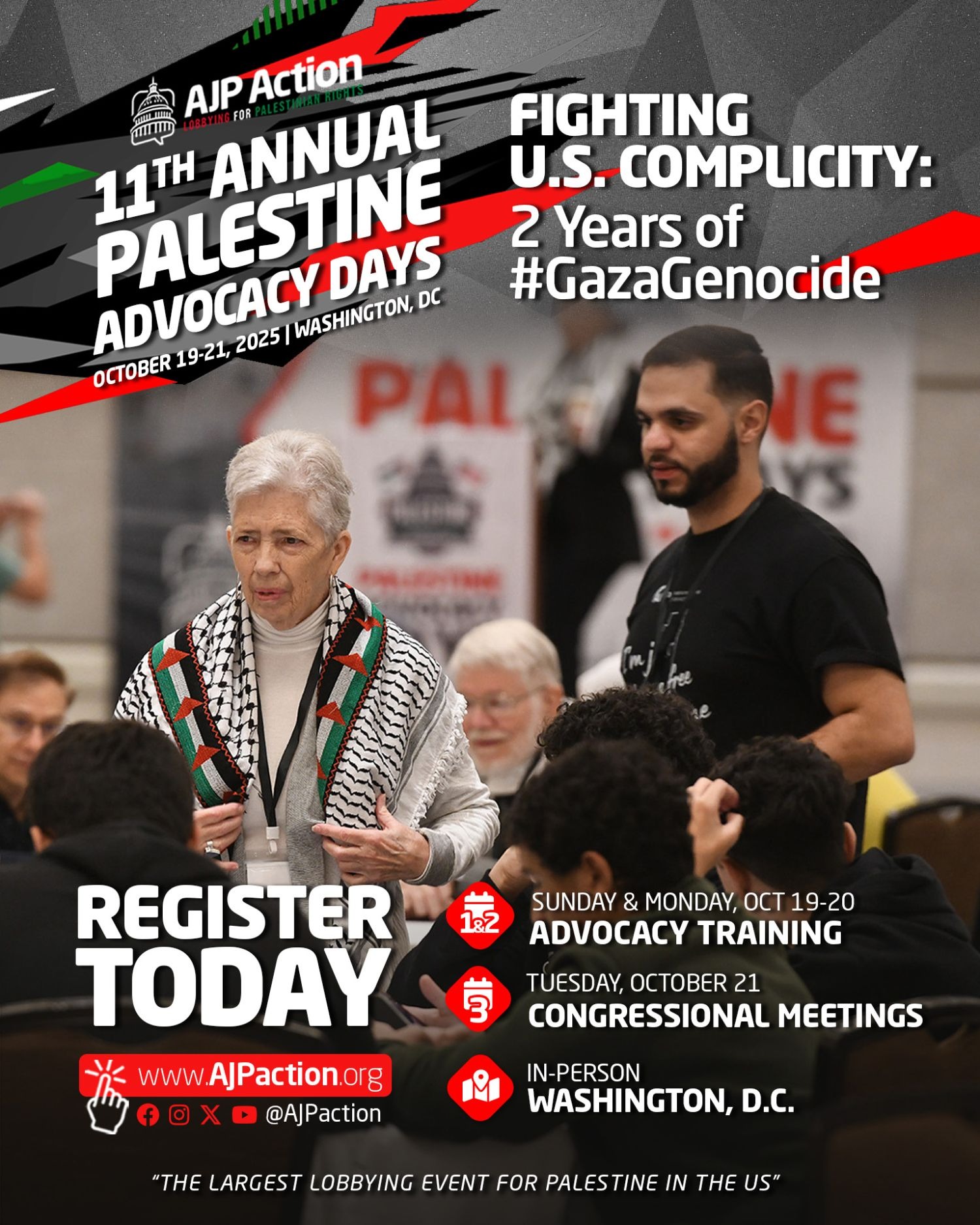 11 Days Until Palestine Advocacy Days: The Work for Justice and Accountability Begins Now Dear Email, Yesterday, a “peace plan” was agreed on to end the war in Gaza. Like so many around the world, we cautiously welcome any step that brings an end to the relentless bombing of Gaza and relief to a people who have endured unimaginable suffering at the hands of the apartheid state. But one thing must be made clear: this “peace plan” is not justice, it’s merely the beginning. As it doesn’t address or resolve the root cause of the issue, which is a. Israel’s occupation of Palestine, b. the United States’ consistent support of Israel. Even if Israel keeps its end of the bargain, our work is far from over. Gaza’s reconstruction, the return of displaced families, accountability for war crimes, and the right of Palestinians to determine their own future all hang in the balance. True peace will only come when U.S. complicity ends, when our government stops arming, funding, and shielding apartheid, and when the Israeli state and its leaders are held fully accountable for two years of genocide and over 77 years of occupation, apartheid, and settler colonialism. With Palestine Advocacy Days just 11 days away, this is our moment to keep the pressure on and ensure that no one mistakes a ceasefire for justice. We cannot allow our leaders to grow complacent while Gaza remains in ruins and Palestinians continue to live under apartheid and occupation. This is our time to show up in the halls of Congress, remind lawmakers that the world is still watching, and that their constituents demand real, lasting, and principled action. Join us in Washington, D.C., October 19–21. Together, we will continue to fight for issues like: - An end to U.S. complicity: no more weapons or military aid to the apartheid state.