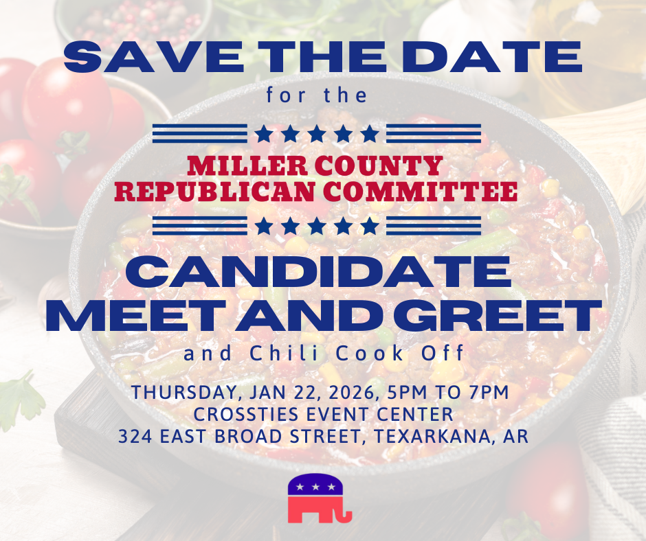 | | Arkansas Federation of Republican Women Convention | | Lawrence County Republicans Charlie Kirk Vigil | | RNC Prayer Call with Pastor Rob McCoy | | Washington County Republican Party MAGA Lincoln-Reagan Day Dinner | | Lawrence County Republican Committee Trump Day Dinner | | Garland County Republicans Lincoln-Reagan Dinner with Missouri Congressman Jason Smith | | Jefferson County Republican Committee Top of the Ticket Dinner with U.S. Senator Tom Cotton and Congressman Bruce Westerman | | Benton County Republicans Star Stripes and Southern Nights Dinner with Attorney General Tim Griffin | | Miller County Republican Committee Candidate Meet and Greet | | | | |