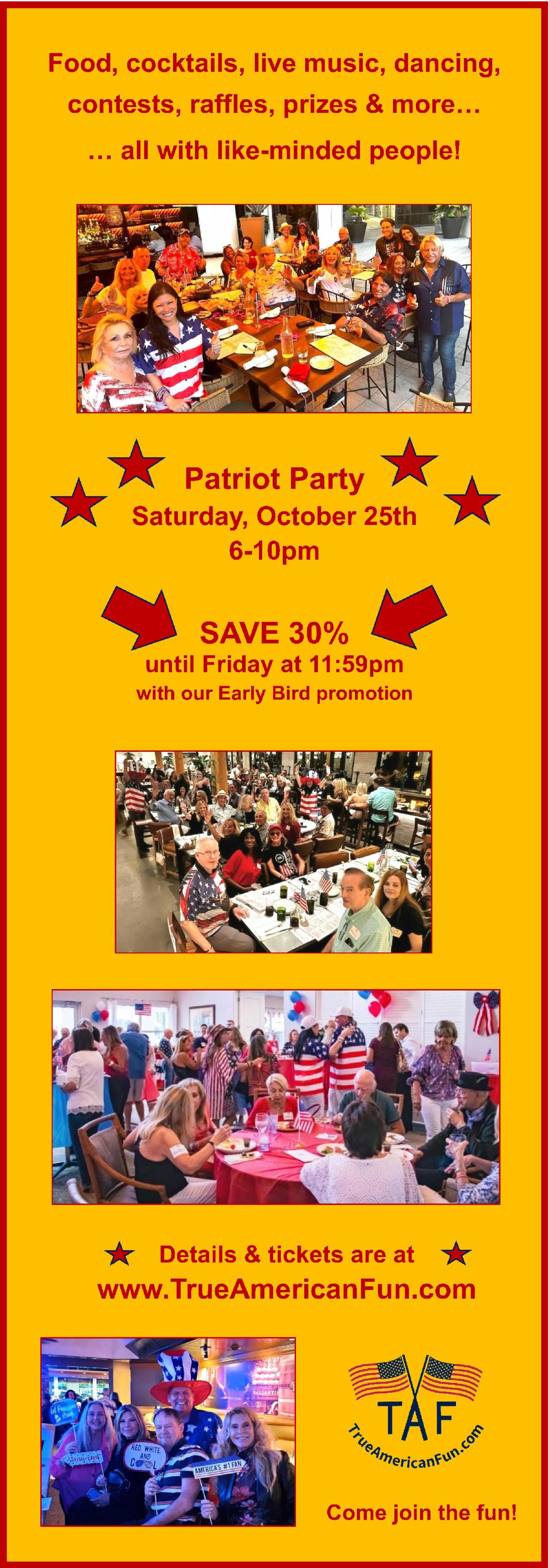 30% OFF early bird discount ends Friday at 11:59pm. Don't miss this great Patriot Party!
