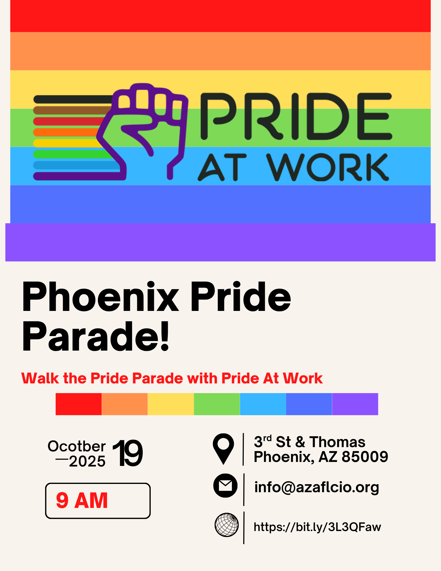 Join the Arizona AFL-CIO at the Phoenix Pride Parade! Click on the button below and fill out the form if you are interested in walking in the parade with us. The parade step-off will occur at 10 AM, so please arrive at the area of 3rd Street & Oak in Phoenix by 9 AM to find us.