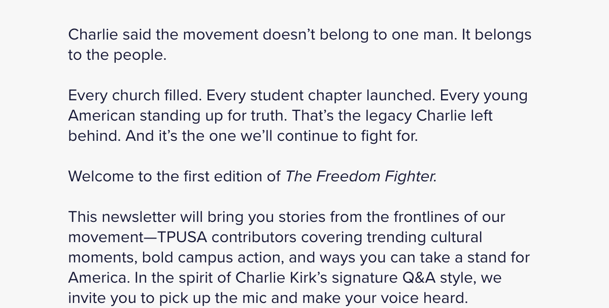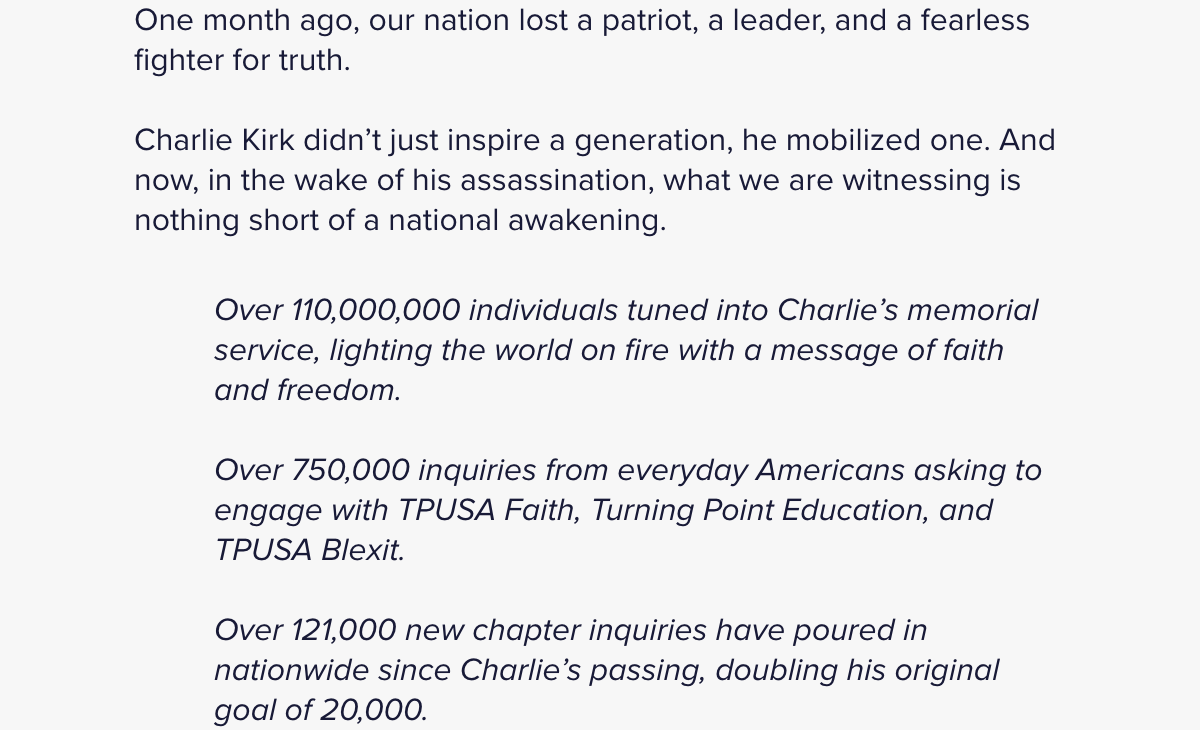 One month after Charlie’s passing, we’re seeing a national awakening—121,000 new chapter inquiries, packed campus tours, rising faith, and a movement more fired up than ever.