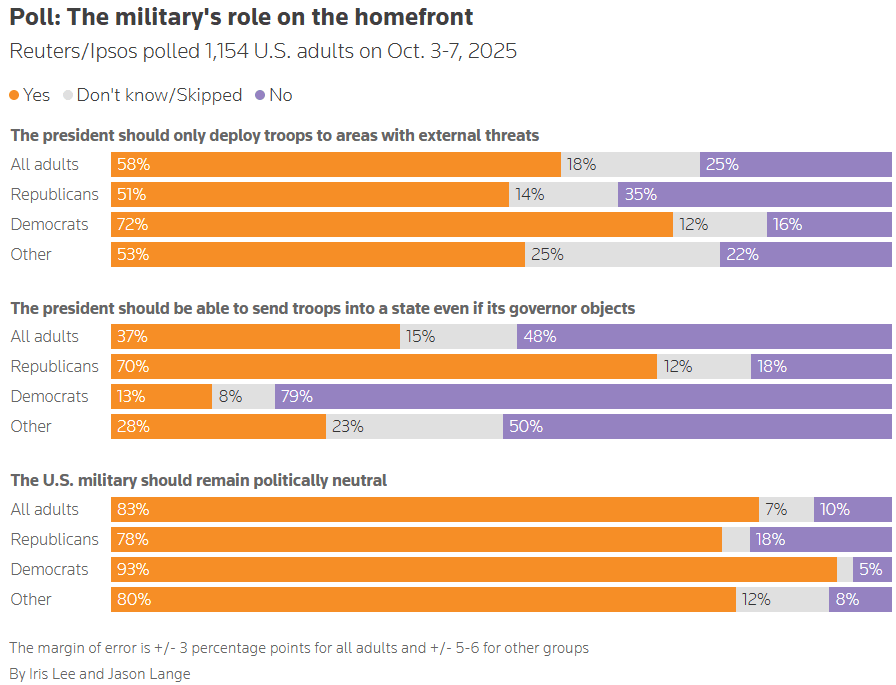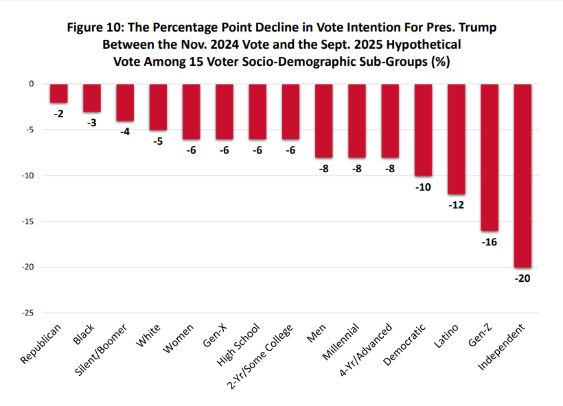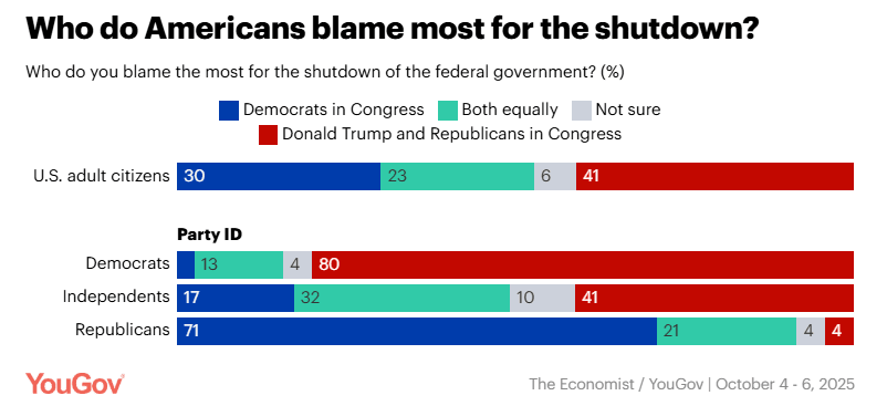 Rick Wilson is on a crazy deadline this week, and Andrew Wilson is in transit, so Behind the Numbers on video will have to wait until next week. But there are numbers. O! Are there numbers?! In case you’re just tuning in, a recap: Trump’s polling on virtually all matters, across all demos, has been plunging for the past few months. Some demographics and some issues see a more dramatic drop than others, but even fewer Republicans are satisfied with his performance on most things. This week, that trend continues. Here are a few things worth noting. The ShutdownNumbers on the shutdown are coming in hot. The below YouGov poll from this week shows that Americans place blame, for the most part, on Republicans. It’s no surprise that 80% of Democrats blame the other party, but what’s really worth noting here are the Independents, who blame the Republicans over Dems 41 to 17. I spoke with Andrew Wilson about this. His takeaway is that these numbers have essentially calcified. He doesn’t see them shifting much either way. Bottom line: Most Americans blame Republicans for the shutdown, and that’s not going to change anytime soon. Vote IntentionI thought about putting this one last because it’s such a big deal, but decided not to (you’ll see why later). The following is a University of Houston Hobby School of Public Affairs/Texas Southern University School of Public Affairs/YouGov poll released today on Trump vote intention. It compared how many people in particular demographics intended to vote for Trump in the past versus how many would vote for him today. You can see that every demographic on the table is negative. Fewer people in each demo would vote for him today than when they went to the polls last November. But more notable is the massive drop with independents. A 20-point drop is the ball game. But that’s not even the biggest story here. The Texas gerrymander was predicated on the Republican’s faith in maintaining the Latino vote share, which went to Trump by 8 points in ‘24 in the Lone Star State. According to the chart below, that advantage has been handily erased and basically reversed. Bottom line: There’s a non-zero chance that not even a wildly partisan mid-decade gerrymander can overcome polling like this. And where does polling like this come from: really bad policy and terrible leadership. Using the Military on AmericansI saved this poll for last because Trump’s use of the military in American cities isn’t just a distraction from all of the above, it’s also potentially catastrophic for Democracy — and deeply unpopular. Deploying your military on your own citizens is the move of a despot with no other options. It’s not intended to win hearts and minds, it’s intended to inject fear into the population so that hearts and minds don’t matter. As you can see below, 83% of all adults believe that the military should remain politically neutral. In other words, our military — the greatest the world has ever seen — should not be used for partisan advantage. Even 78% of Republicans buy into the neutrality of our armed forces. Again, I saved this for last because it lays bare the Trump/Stephen Miller strategy. It is not a policy strategy. It isn’t about creating a better America for you. It’s not about lowering costs, ensuring access to healthcare or clean air or potable water. It’s about sheer power. And most of us hate it. You’re currently a free subscriber to Lincoln Square Media. For full access to our content, our Lincoln Loyal community, and to help us amplify the facts about the assault on our rights and freedoms, please consider upgrading your subscription today with this limited-time offer: Not ready to subscribe? Make a one-time donation of $10 or more to support our work amplifying the facts on social media, targeted to voters in red states and districts that we can help flip. Every $10 reaches 1000 Americans. The Truth needs a voice. Your donation will help us amplify it. Want to help amplify this post? Please leave a comment and tell us what you think. |