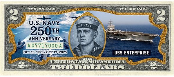 To commemorate the 250th Anniversary of the U.S. Navy, the Merrick Mint has authorized the release of this collectible $2 bill.