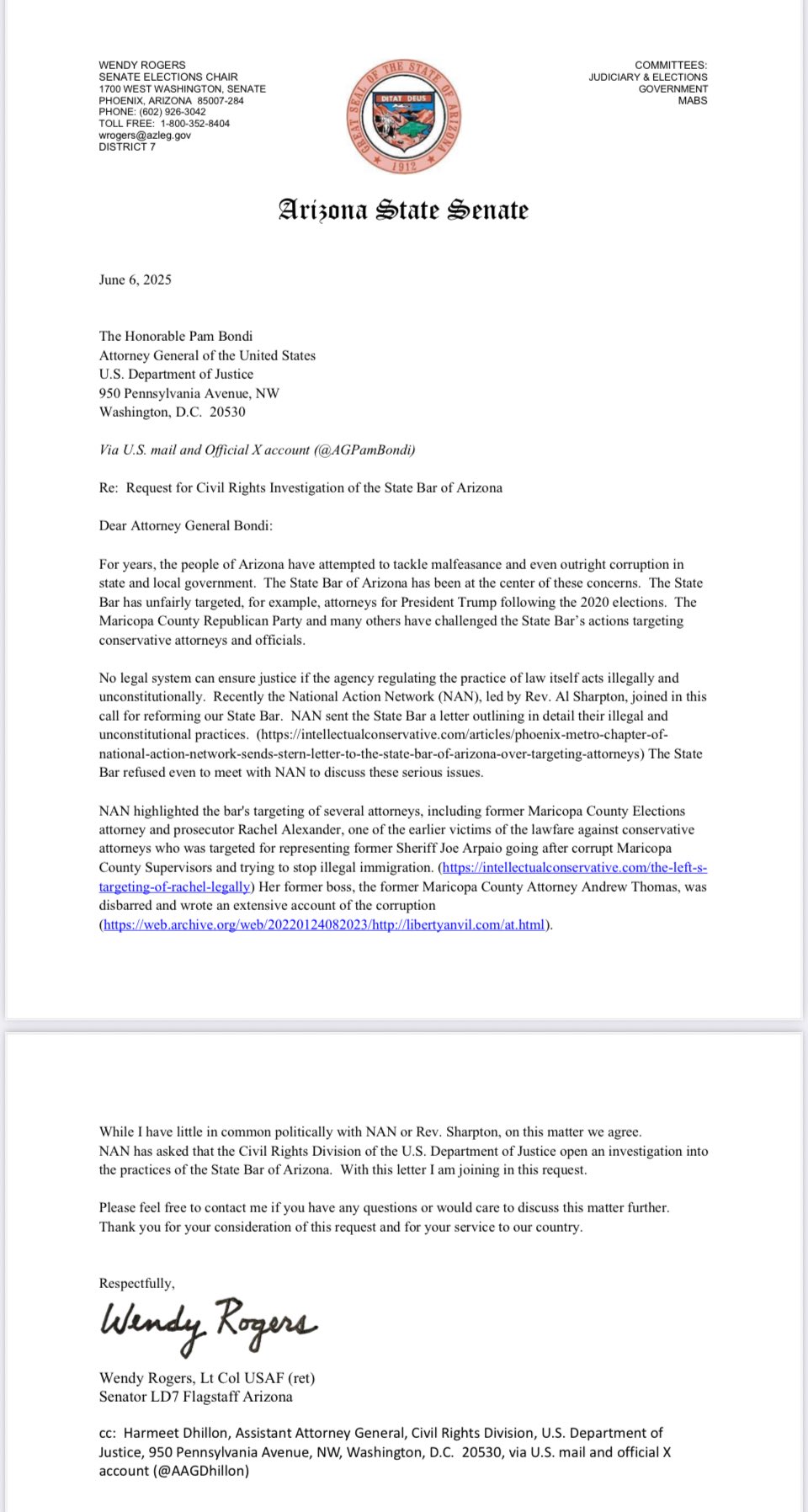 Senator Wendy Rogers and I both sit on the Arizona Senate Judiciary Committee - and we’re taking this fight into federal court. We are standing up to the corrupt State Bar and demanding accountability at the national level.