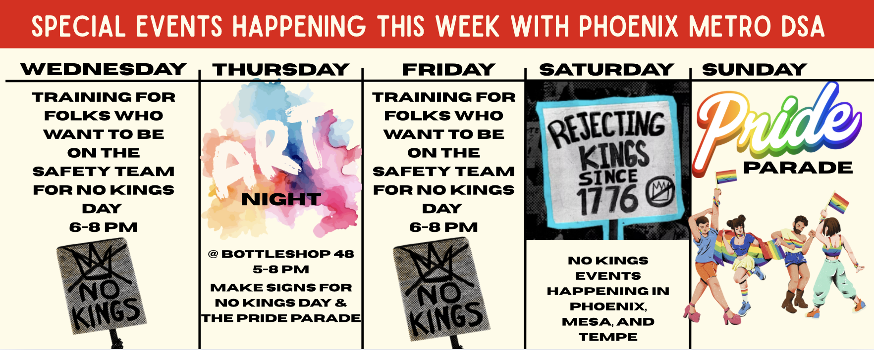 Phoenix Metro DSA members will be at (at least!) 3 events around the Valley: Phoenix, Tempe, and Mesa.