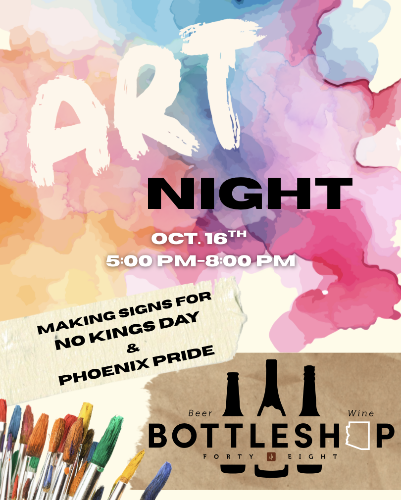 The Art Working Group is putting on an Art Night for folks who want to make signs for both Phoenix Pride and No Kings Day at Bottleshop 48 this Thursday!