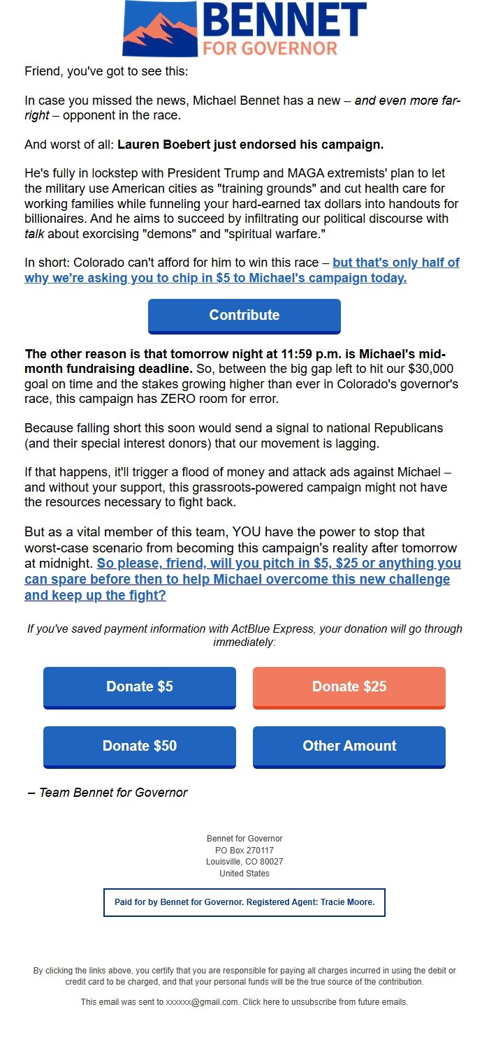 Paid for by Bennet for Governor. Registered Agent: Tracie Moore.