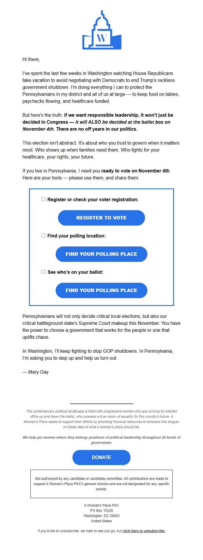 But here’s the truth: if we want responsible leadership, it won’t just be decided in Congress — it will ALSO be decided at the ballot box on November 4th . There are no off years in our politics.