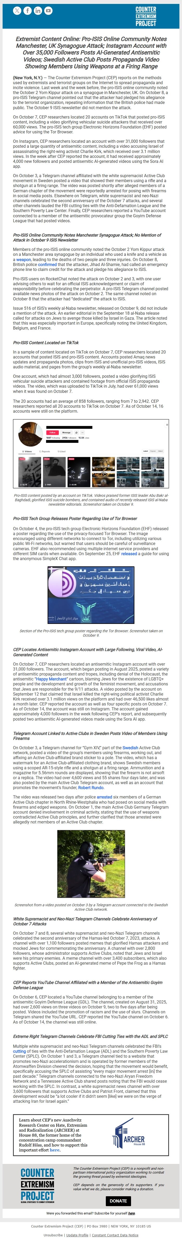 Email from Counter Extremism Project (CEP) Swedish Active Club Posts Propaganda Video Showing Members Using Weapons at a Firing Range Extremist Content Online: Pro-ISIS Online Community Notes Manchester, UK Synagogue Attack; Instagram Account with Over 35,000 Followers Posts AI-Generated Antisemitic Videos; Swedish Active Club Posts Propaganda Video Showing Members Using Weapons at a Firing Range (New York, N.Y.) — The Counter Extremism Project (CEP) reports on the methods used by extremists and terrorist groups on the Internet to spread propaganda and incite violence. Last week and the week before, the pro-ISIS online community noted the October 2 Yom Kippur attack on a synagogue in Manchester, UK. On October 8, a pro-ISIS Telegram channel pointed out that the attacker had pledged his allegiance to the terrorist organization, repeating information that the British police had made public. The October 9 ISIS newsletter did not mention the attack. On October 7, CEP researchers located 20 accounts on TikTok that posted pro-ISIS content, including a video glorifying vehicular suicide attackers that received over 60,000 views. The pro-ISIS tech group Electronic Horizons Foundation (EHF) posted advice for using the Tor Browser. On Instagram, CEP researchers located an account with over 31,000 followers that posted a large quantity of antisemitic content, including a video accusing Israel of assassinating the right-wing activist Charlie Kirk, which received over 3.1 million views. In the week after CEP reported the account, it had received approximately 4,000 new followers and posted antisemitic AI-generated videos using the Sora AI app. On October 3, a Telegram channel affiliated with the white supremacist Active Club movement in Sweden posted a video that showed their members using a rifle and a shotgun at a firing range. The video was posted shortly after alleged members of a German chapter of the movement were reportedly arrested for posing with firearms in social media posts. Elsewhere on Telegram, white supremacist and neo-Nazi channels celebrated the second anniversary of the October 7 attacks, and several other channels lauded the FBI cutting ties with the Anti-Defamation League and the Southern Poverty Law Center. Finally, CEP researchers reported a YouTube account connected to a member of the antisemitic provocateur group the Goyim Defense League that had posted videos. Pro-ISIS Online Community Notes Manchester Synagogue Attack; No Mention of Attack in October 9 ISIS Newsletter Members of the pro-ISIS online community noted the October 2 Yom Kippur attack on a Manchester area synagogue by an individual who used a knife and a vehicle as a weapon, leading to the deaths of two people and three injuries. On October 8, British police confirmed that the attacker, Jihad Al-Shamie, had called an emergency phone line to claim credit for the attack and pledge his allegiance to ISIS. Pro-ISIS users on RocketChat noted the attack on October 2 and 3, with one user advising others to wait for an official ISIS acknowledgement or claim of responsibility before celebrating the perpetrator. A pro-ISIS Telegram channel posted available news photos of the attack on October 2. The same channel noted on October 8 that the attacker had “dedicated” the attack to ISIS. Issue 516 of ISIS’s weekly al-Naba newsletter, released on October 9, did not include a mention of the attack. An earlier editorial in the September 18 al-Naba release called for attacks on Jews to avenge those killed by Israel in Gaza. The article noted that this was especially important in Europe, specifically noting the United Kingdom, Belgium, and France. Pro-ISIS Content Located on TikTok In a sample of content located on TikTok on October 7, CEP researchers located 20 accounts that posted ISIS and pro-ISIS content. Accounts posted Amaq news updates and propaganda photos, clips from ISIS and unofficial pro-ISIS videos, ISIS audio material, and pages from the group’s weekly al-Naba newsletter. One account, which had almost 3,000 followers, posted a video glorifying ISIS vehicular suicide attackers and contained footage from official ISIS propaganda videos. The video, which was uploaded to TikTok in July, had over 61,000 views when it was found on October 7. The 20 accounts had an average of 858 followers, ranging from 7 to 2,942. CEP researchers reported all 20 accounts to TikTok on October 7. As of October 14, 16 accounts were still on the platform. Pro-ISIS content posted by an account on TikTok. Videos praised former ISIS leader Abu Bakr al-Baghdadi, glorified ISIS suicide bombers, and contained audio of recently released ISIS al-Naba newsletter editorials. Screenshot taken on October 9. Pro-ISIS Tech Group Releases Poster Regarding Use of Tor Browser On October 4, the pro-ISIS tech group Electronic Horizons Foundation (EHF) released a poster regarding the use of the privacy-focused Tor Browser. The image encouraged using different networks to connect to Tor, including utilizing various public Wi-Fi networks, but warned that users should be careful of surveillance cameras. EHF also recommended using multiple internet service providers and different SIM cards when available. On September 25, EHF released a guide for using the anonymous SimpleX Chat app. Section of the Pro-ISIS tech group poster regarding the Tor Browser. Screenshot taken on October 9. CEP Locates Antisemitic Instagram Account with Large Following, Viral Video, AI-Generated Content On October 7, CEP researchers located an antisemitic Instagram account with over 31,000 followers. The account, which began posting in August 2025, posted a variety of antisemitic propaganda content and tropes, including denial of the Holocaust, the antisemitic “Happy Merchant” cartoon, blaming Jews for the existence of LGBTQ+ people and the development and growth of the feminist movement, and accusations that Jews are responsible for the 9/11 attacks. A video posted by the accoun