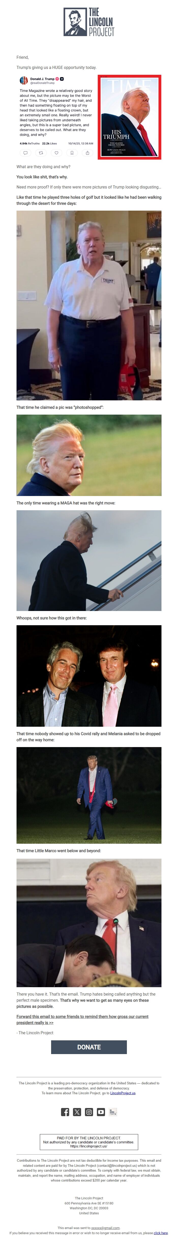 There you have it. That’s the email. Trump hates being called anything but the perfect male specimen. That's why we want to get as many eyes on these pictures as possible.