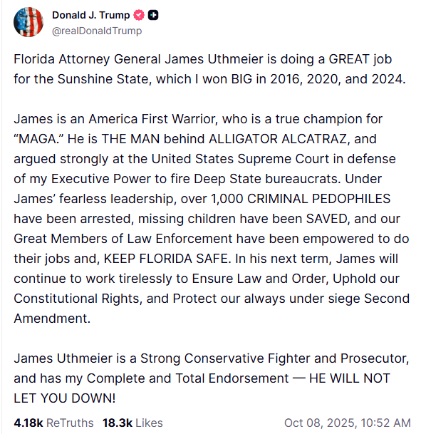 Big news! President Donald J. Trump has thrown his full support behind our fearless Attorney General, James Uthmeier, for a full term in 2026!