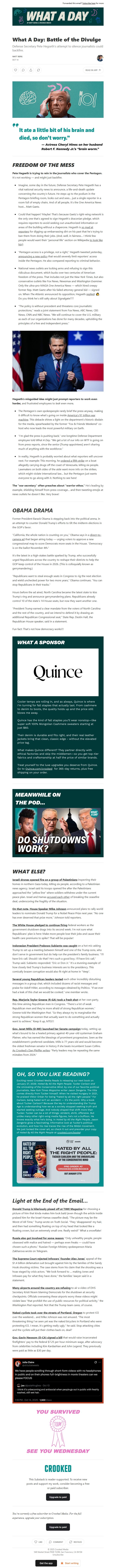 Could that happen? Maybe! That’s because Gaetz’s right-wing network is the only one that’s agreed to sign Hegseth’s draconian pledge, which requires reporters to avoid seeking out unauthorized information or areas of the building without a chaperone. Hegseth is so mad at reporters [ [link removed] ] for digging up embarrassing dirt on his past that he’s trying to ban them from doing their jobs. (And, well, in fairness… I think few people would want their “personal life” section on Wikipedia to look like his [ [link removed] ]!)
