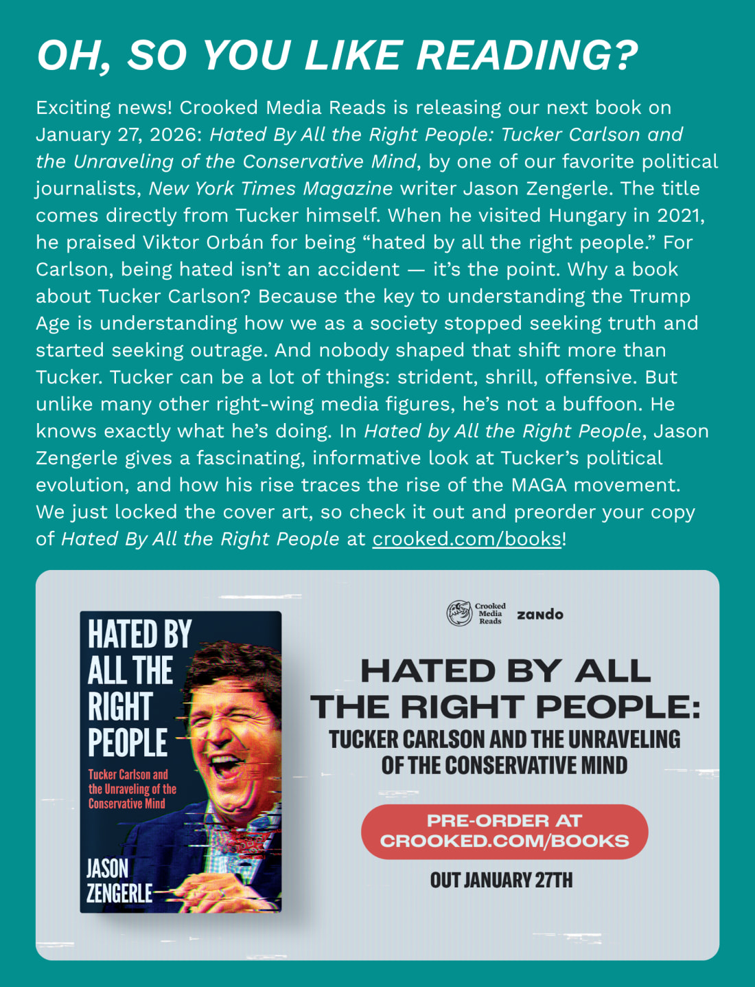 The “war secretary” often preaches about “warrior ethos.” He’s leading by example, shielding himself from press coverage… and then tweeting emojis at news outlets he doesn’t like. Very brave! OBAMA DRAMAFormer President Barack Obama is stepping back into the political arena, in an attempt to counter Donald Trump’s efforts to tilt the midterm elections in the GOP’s favor. “California, the whole nation is counting on you,” Obama says in a direct-to-camera ad that began airing today — urging voters to approve a new congressional map to score Democrats more seats in the House. “Democracy is on the ballot November 4th.” It’s the latest in a high-stakes battle sparked by Trump, who successfully urged Republicans across the country to reshape their districts to help the GOP keep control of the House in 2026. (This is colloquially known as gerrymandering.) “Republicans want to steal enough seats in Congress to rig the next election and wield unchecked power for two more years,” Obama continues. “You can stop Republicans in their tracks.” Hours before the ad aired, North Carolina became the latest state to kiss Trump’s ring and announce gerrymandering plans. Republicans already control 10 of the state’s 14 House seats, but now they want another one. “President Trump earned a clear mandate from the voters of North Carolina and the rest of the country, and we intend to defend it by drawing an additional Republican Congressional seat,” State Rep. Destin Hall, the Republican House speaker, said in a statement. Fun fact: That’s not how democracy works!!! WHAT ELSE?Israeli drones opened fire on a group of Palestinians inspecting their homes in northern Gaza today, killing six people, according to a Palestinian news agency. Israel said its troops opened fire after the Palestinians approached the “yellow line” where soldiers withdrew under the current peace plan. Israel and Hamas accused each other of breaking the ceasefire deal, underscoring the fragility of the situation. On that note, House Speaker Mike Johnson announced plans to rally world leaders to nominate Donald Trump for a Nobel Peace Prize next year. “No one has ever deserved that prize more,” Johnson told reporters. The White House pledged to continue firing federal workers as the government shutdown drags into its second week. I’m not sure what Republicans’ plan is here: Make more people lose their jobs and cause their health care premiums to spike? That will be popular! Indonesian President Prabowo Subianto was caught on a hot mic asking Trump to set up a meeting between himself and one of the Trump sons, who don’t serve in government but do help run the president’s family business. “I’ll have Eric call. Should I do that? He’s such a good boy. I’ll have Eric call,” Trump said. Subianto responded: “Eric or Don Jr.” It’s a stunning example of how closely tied Trump’s business interests are to the presidency. This comically brazen corruption would also fit right at home in “Veep”. Several young Republican leaders texted each other incredibly disturbing messages in a group chat, which included dozens of racist messages and praise for Adolf Hitler, according to messages obtained by Politico. “If we ever had a leak of this chat we would be cooked,” one member wrote. Rep. Marjorie Taylor Greene (R-GA) took a fresh shot at her own party, this time aiming Republican men in Congress. “There’s a lot of weak Republican men and they’re more afraid of strong Republican women,” Greene told the Washington Post. “So they always try to marginalize the strong Republican women that actually want to do something and actually want to achieve.” Keep it up, MTG!!! Gov. Janet Mills (D-ME) launched her Senate campaign today, setting up what’s bound to be a heated primary against 40-year-old oysterman Graham Platner, who has earned the blessings of prominent progressives. Seen as the establishment’s preferred candidate, Mills is 77 years old and would become the oldest freshman senator in history if she beats incumbent Susan Collins. As Crooked’s Dan Pfeiffer writes: “Party leaders may be repeating the same mistakes from 2024.” Light at the End of the Email…Donald Trump is hilariously pissed off at TIME Magazine for choosing a picture of him that kinda makes him look bald (even though the article inside praised him for the Israel-Hamas ceasefire deal). “The picture may be the Worst of All Time,” Trump wrote on Truth Social. “They ‘disappeared’ my hair, and then had something floating on top of my head that looked like a floating crown, but an extremely small one. Really weird!” What a snowflake! Russia also got involved for some reason: “Only unhealthy people, people obsessed with malice and hatred — perhaps even freaks — could have chosen such a photo,” Russian Foreign Ministry spokesperson Maria Zakharova wrote on Telegram. The Supreme Court rejected Infowars’ founder Alex Jones’ appeal of the $1.4 billion defamation suit brought against him by the families of the Sandy Hook shooting victims. The case stems from his claim that the shooting was a hoax staged by crisis actors. “We look forward to … making Jones and Infowars pay for what they have done,” the families’ lawyer said in a statement. Many airports around the country are refusing to air a video of DHS Secretary Kristi Noem blaming Democrats for the shutdown at security checkpoints. Officials overseeing these airports worry these videos might violate laws “that prohibit the use of public resources for political activity,” the Washington Post reported. Not that the Trump team cares, of course. Naked cyclists took over the streets of Portland, Oregon to protest ICE over the weekend… and Mike Johnson was not amused. “The most threatening thing I’ve seen yet was the naked bicyclers in Portland who were protesting ICE. I mean, it’s getting really ugly,” he