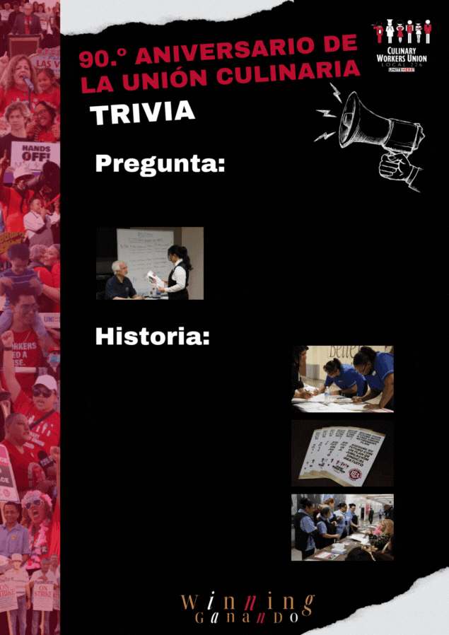 Juega a nuestra trivia cada semana en redes sociales para descubrir m谩s sobre la historia de la Uni贸n Culinaria que ha luchado por una vida mejor para los trabajadores de la hosteler铆a.
