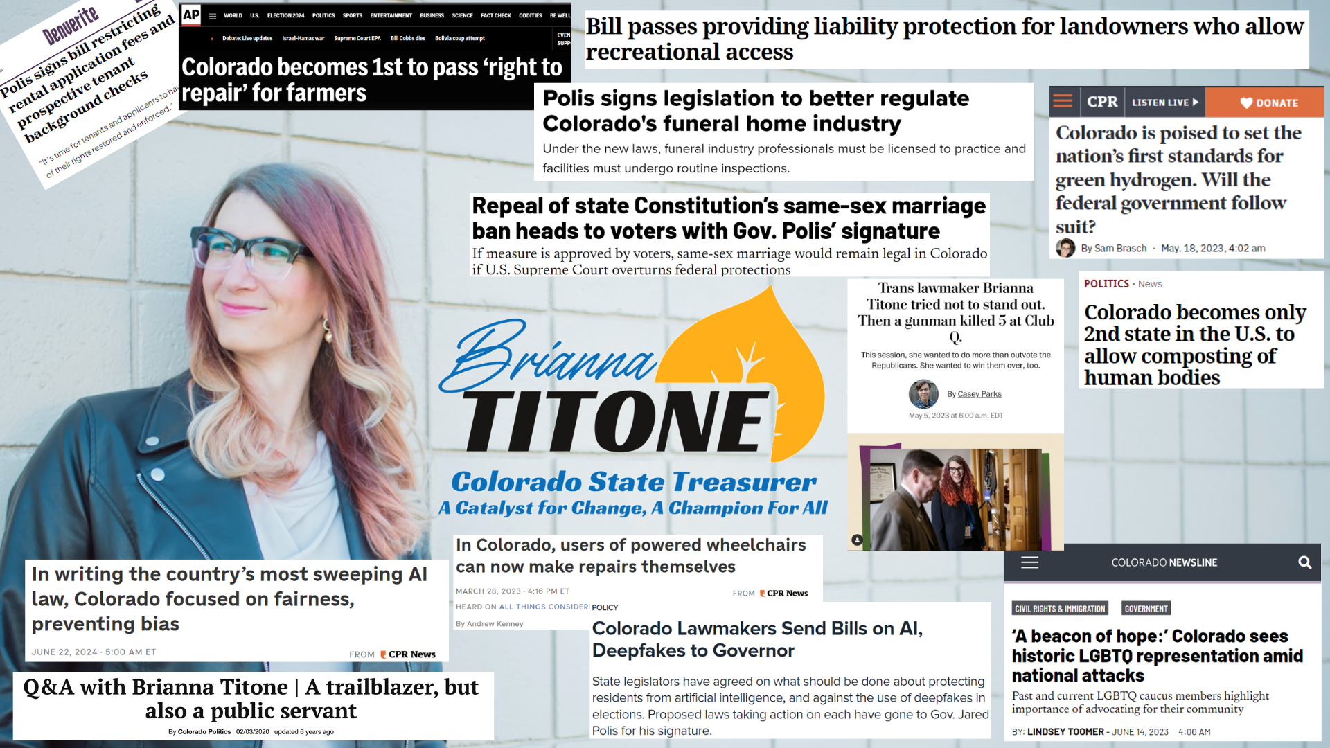 Hi friends, Brianna Titone is no stranger to breaking barriers. As the first transgender legislator elected in Colorado, she’s been a trailblazer for equality and representation. In her 7+ years in the legislature, she has been massively effective passing first-in-the-nation bills and thoughtful bipartisan policies. Now, Brianna is ready to make history again. If elected Colorado’s next State Treasurer, she would become the first transgender person in the NATION ever elected to a statewide executive office.  This race isn’t just about making history — it’s about delivering results. Brianna will protect Colorado’s future by fighting for fiscal responsibility, fairness, and policies that put people first. She can’t do it without grassroots supporters like you. Will you chip in today to help elect Brianna and keep Colorado moving forward? Thank you for being part of this movement. — Team Titone Fighting for working families, consumer protections, and small businesses in the House of Representatives has been the honor of Brianna's lifetime. Brianna is running to be your next Colorado State Treasurer to support small businesses, and fight hard to save hard-working Coloradans money. Follow Brianna Online:   Paid for by Brianna for Treasurer. Registered Agent Brianna Titone. |