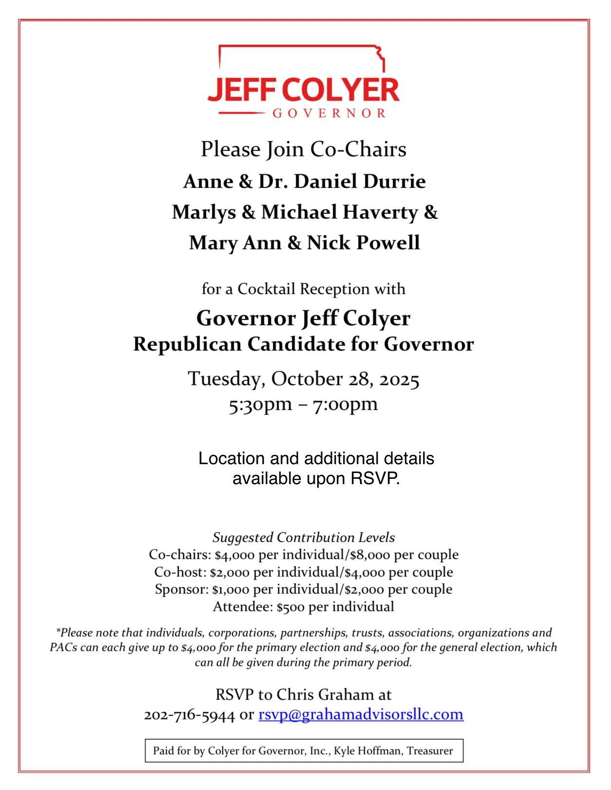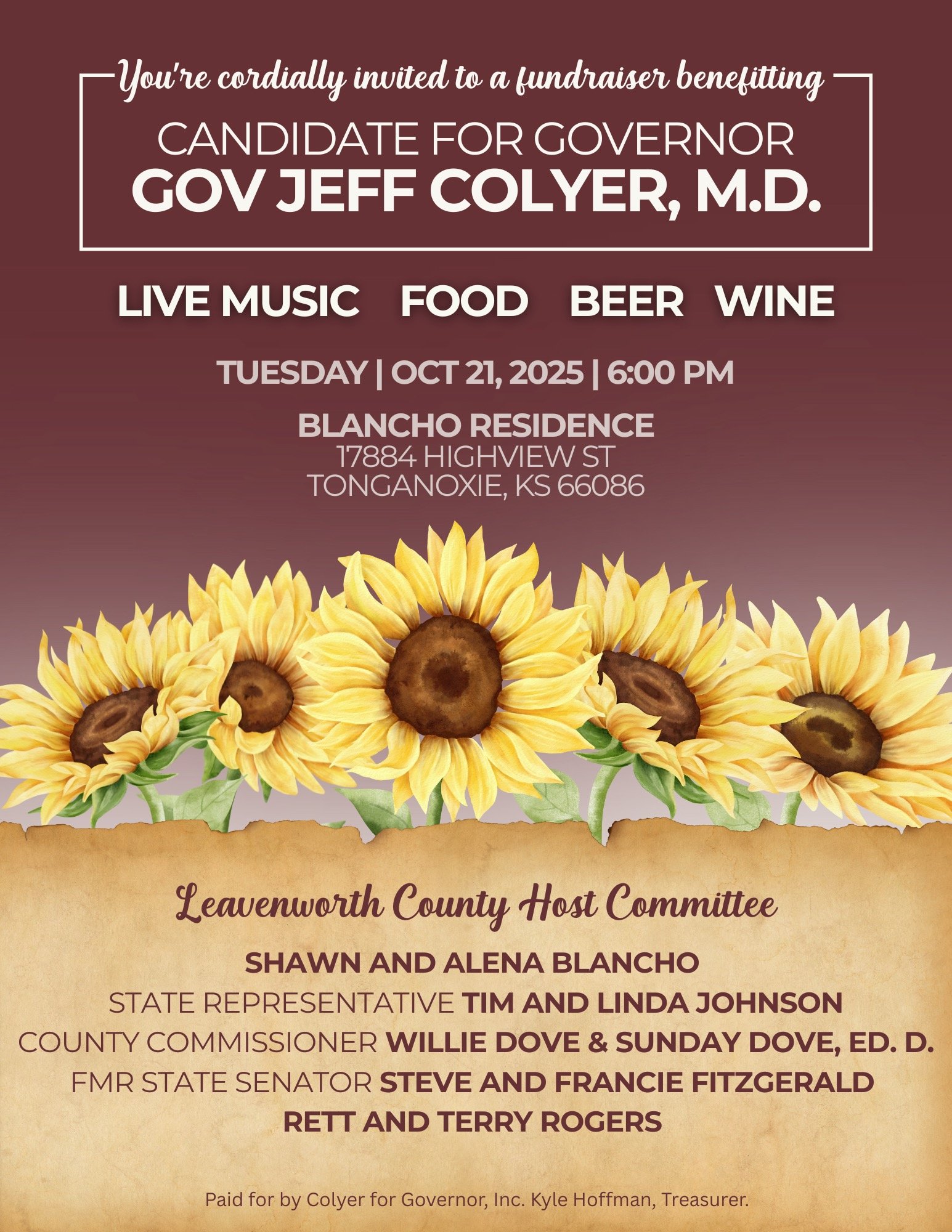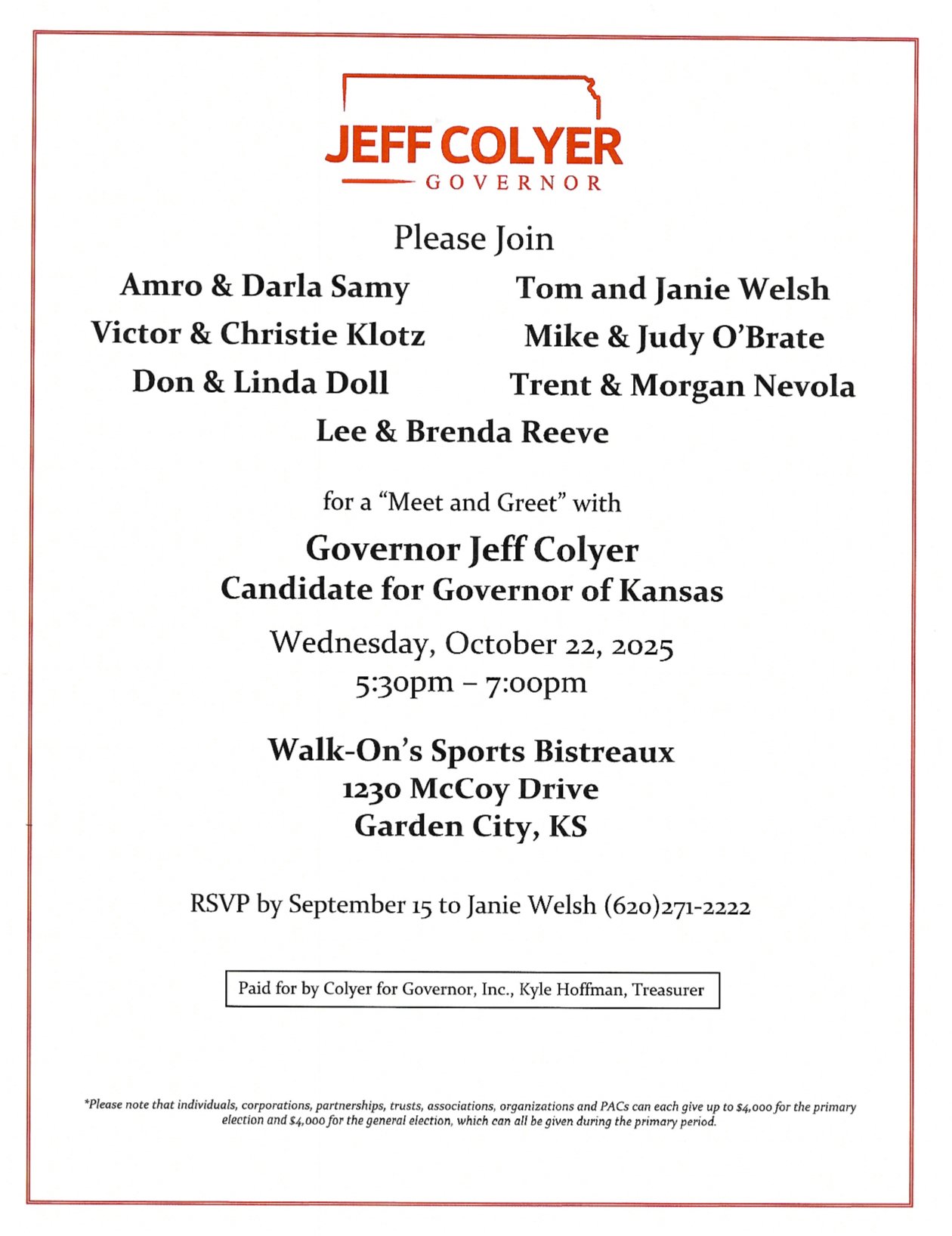 We just wanted to reach out to personally invite you to next weeks upcoming fundraisers for Gov Colyer. These will be in Tonganoxie, Garden City, and Kansas City.