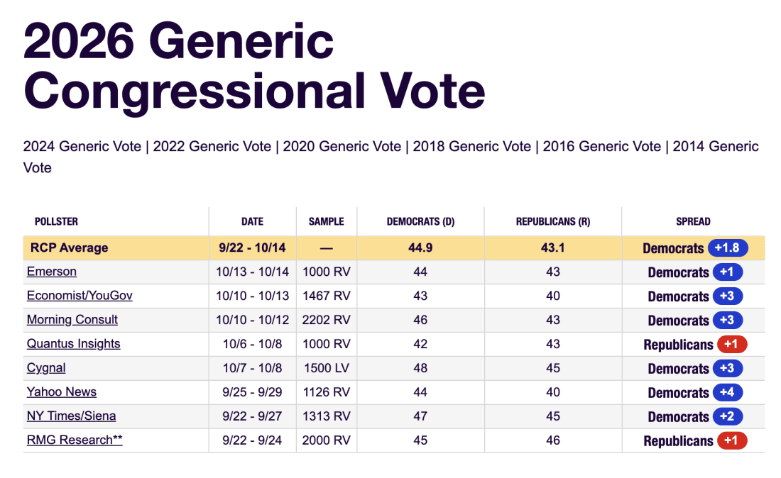The numbers are in, and there are a few surprises. The race for N.J. gov is tightening, which is to be expected this far into October. Will Democrat Mikie Sherrill pull it off? In somewhat less surprising news, the polling on the economy, cost of living, and inflation is dragging on Trump, and for good reason. Prices go up, polling goes down. And Trump is doing everything in his power to wreck the economy. Inflation — Biden’s boogeyman — has returned to haunt Trump. But where the rubber really hits the road is in the generic Congressional ballot (see below). Obviously, there’s a million years until November 2026 (or so it would feel like), but Dems, despite all their weaknesses, are still polling ahead of Republicans. Just imagine what would happen if Dems showed some spine! Are you going to a protest this weekend? If so, let us know in the comments — and above all else, be safe, be peaceful, and let your voice be heard. We are building a movement and it’s amazing to see what you’re doing in your communities. You’re currently a free subscriber to Lincoln Square Media. For full access to our content, our Lincoln Loyal community, and to help us amplify the facts about the assault on our rights and freedoms, please consider upgrading your subscription today with this limited-time offer: Not ready to subscribe? Make a one-time donation of $10 or more to support our work amplifying the facts on social media, targeted to voters in red states and districts that we can help flip. Every $10 reaches 1000 Americans. The Truth needs a voice. Your donation will help us amplify it. Want to help amplify this post? Please leave a comment and tell us what you think. |