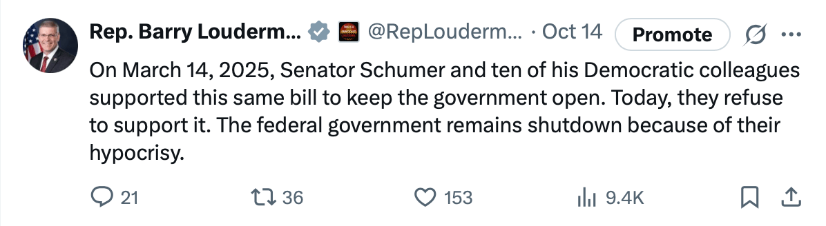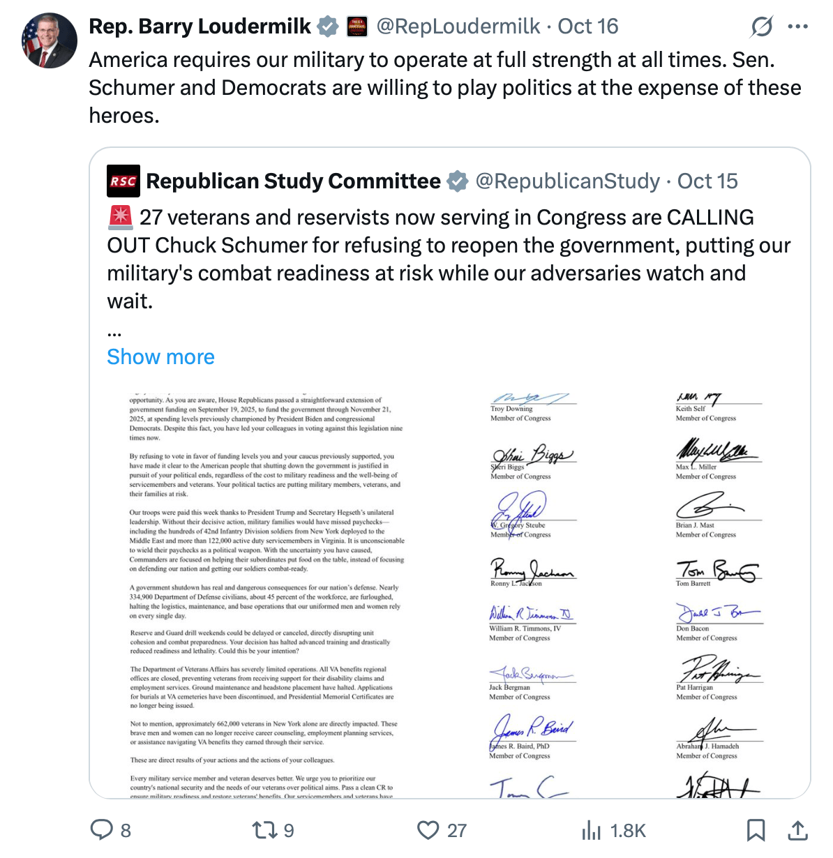 Letter led by RSC Chairman Pfluger to Senate Minority Leader Chuck Schumer, urging Senator Schumer and the Democratic Caucus to vote to reopen the government in order to restore military readiness and financial stability for the countless servicemembers impacted by the Democrat Shutdown
