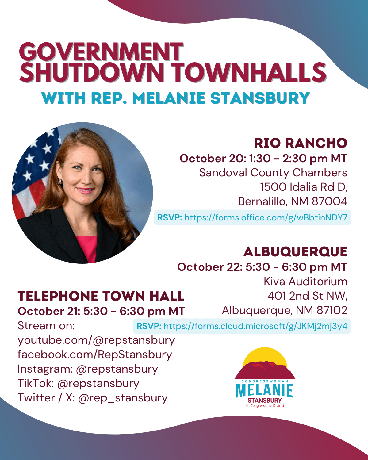 I'm back in New Mexico and holding town halls in NM-01 next week! Join us to learn the latest on the Republican government shutdown and how we're fighting back.