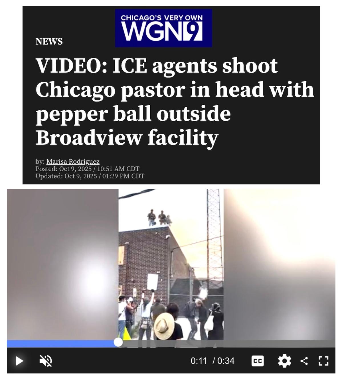 ICE agents have responded to peaceful protests with unwarranted violence and brutality, in many cases chasing people down, deploying pepper spray, tear gas, and shooting pellets at unarmed and non-threatening protestors. In Chicago, ICE was caught on video shooting a pastor in the head with pepper ball projectiles as he was standing, unarmed, peacefully protesting from a safe distance in front of them: