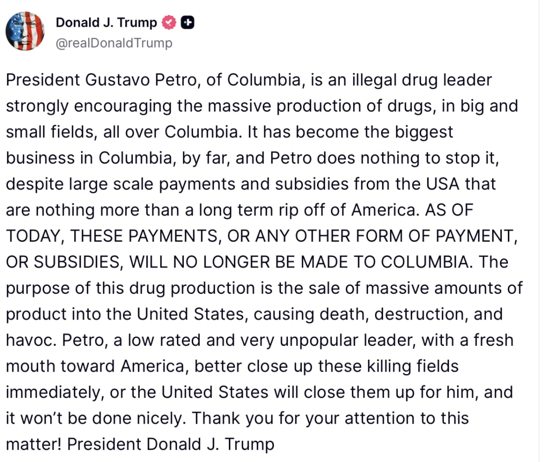 I recently returned from a trip to Colombia where I had the chance to speak with the country’s business and political leaders and share my thoughts on global trends, the ongoing trade war, and America’s re-emerging interest in their part of the world. In preparation for my speech at the #CaribeBizForum 2025, I read and reviewed news, podcasts, videos, and reports to bring myself up to speed on developments in Colombia since my last trip to the country. Anyone following Colombia will be aware of the growing tension between Washington and Bogota which was on full display during the most recent meetings of the UN General Assembly. Colombian President Gustavo Petro’s address to the global gathering was an unabashedly left-wing socialist rant, focusing on climate change urgency, Western hypocrisy, the evils of capitalism, the urgent need for redistribution, and the tyrannical behavior of the United States. It’s a truly remarkable speech that I’d encourage everyone to listen to, especially my friends in Asia, Africa, Australia, and Europe. (After listening, I suspect you won’t be surprised to learn—if you didn’t already know—that Petro had been a member of the M-19 guerrilla group and served time in prison). The part of his address that I found most interesting was his lashing out at the United States. The speech took issue with the recent U.S. strikes against drug smugglers in the Caribbean, linking them to the situation in Gaza. Petro claimed that that 17 unarmed young people were killed by missiles in open seas under the pretext of stopping drug trafficking, called for criminal cases to be brought against U.S. officials, including U.S. President Donald Trump, and said that these attacks were not about fighting drugs but were instead about using violence to dominate the people of South America. Petro also used his time in New York to grab a megaphone and, true to his populist instincts (or perhaps guided by his media consultant?), took to the streets. He called on all American military professionals to “disobey Trump’s orders” and not point their guns at humans. The US State Department revoked his visa—noting his comments were “reckless and incendiary”—and threatened to deport him if he did not leave the country. Longtime readers know that I have often written about the changing U.S. global role under the Trump Administration. While some see isolationism, I see refocusing. While some see hypocrisy in pulling back from the War on Terror while using the same tactics and legal justifications to wage a War on Drugs, I see consistency. And while some see confusion in eschewing military interventionism in other parts of the world while blowing drug boats out of the water off the coast of South America, I see a coherent policy. The U.S. isn’t pulling back from the world altogether but rather prioritizing the local neighborhood. I have called this dynamic the Trump Doctrine and refer to it as the 21st century reincarnation of the Monroe Doctrine. Let’s also remember that Colombia has a free trade agreement with the United States, has historically received hundreds of millions of dollars in support from Washington, and has been a strong partner with the US in the fight against drugs. For decades, US presidents have praised Bogota for its improving security, domestic peace process, cooperation in the war on drugs, and economic partnership with America. President Biden even referred to Colombia as the “keystone” to a prosperous Western Hemisphere. Add to this context the blunt reality, as I repeatedly said for years, that the United States is increasingly focusing on North-South relations while retrenching from East-West relations. The Caribbean is a focal point of these efforts, in large part because of Venezuela and its strong ties to China, Russia, and Iran. In 2023, I noted the rapidly rising risk of war coming to South America because of Venezuelan saber-rattling and I continue to believe the possibility of armed conflict remains elevated. The U.S. build-up in the region is already the largest since the Cold War, and it includes naval assets such as a cruise missile destroyers and a nuclear sub, aviation assets such as fighter jets, spy planes, and B-52 nuclear bombers, and 6,500 troops. The 160th Special Operations Aviation Regiment – the “Night Stalkers” of Black Hawk Down fame – was also recently deployed, and the unit provides support for special operations forces. It’s in this context that I find Petro’s UN speech and subsequent media stunt so stunning. It struck me as undignified for a head of state to visit another country and to brazenly call on that country’s armed forces to disobey that country’s commander in chief. How might Bogota react if President Trump visited Colombia and delivered a similar message? The relationship, I suspect, is likely to deteriorate further. In fact, just this morning, President Trump posted the following to Truth Social: I realize that as an American I’m biased, but I suspect that a productive working relationship with the United States is in Colombia’s best interests. Colombia should realize that America is serious about protecting its own interests, and that includes stopping the flow of drugs into our country. But as I’ve repeatedly said, America First doesn't mean America Alone. Colombia and the US can (and should) have a productive working relationship. I’ve been closely watching Colombia for more than a decade and have spent time in Bogota, Cali, Barranquilla, Cartagena, and Medellin. I know the Colombian people are practical, hard-working, and above all peace-loving. They want a better life for their families and their communities. Unfortunately, Colombia’s leader—a dogmatic socialist—has proactively decided to take on Trump, a practical capitalist. While the world is filled with uncertainty, it seems fairly certain that Petro’s escalation of tensions with the United States is unlik