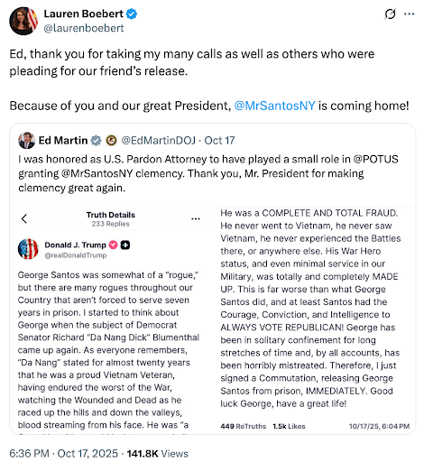 Earlier this week, we highlighted how Lauren Boebert made an official call for the release of former Republican Congressman and disgraced convicted conman felon, George Santos, to be released from prison.