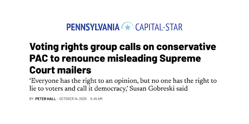 Defend Our Courts is taking a stand and is working to counter the GOP’s lies in this critical election. Already our Vote Yes ads and mailers have reached millions of PA voters but we are still being outspent 10-1.