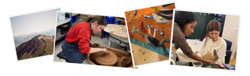 People like Chris Hughes (horse riding), Rosie Jones (listening to Chappell Roan), and Darcey from the CALM team (pottery).