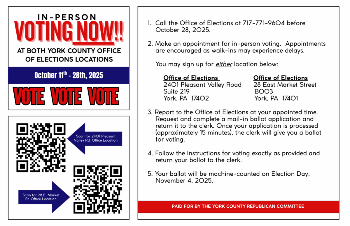 For any inquiries or assistance regarding voter registration, voting, and polling information, we encourage you to reach out to the York County Republican Committee at 717-854-7276.