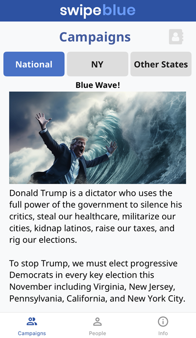 Click "Campaigns" at the bottom left as circled in the image above. Under the "National" tab scroll down to see our Blue Wave campaign near the top. Click the image to see all of your Democratic friends in the crucial 2025 states.