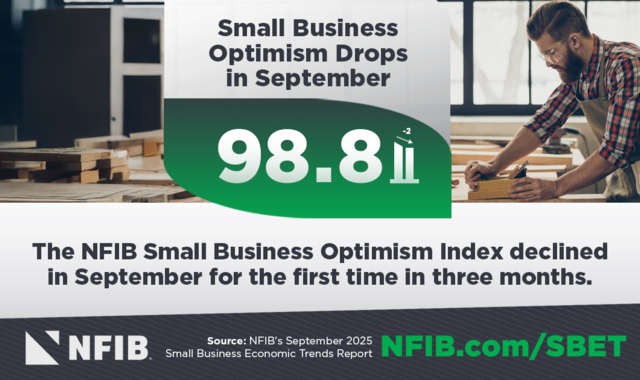 The NFIB Small Business Optimism Index fell two points to 98.8, slightly above average, with inflation and increased concerns about the growth outlook as major causes.