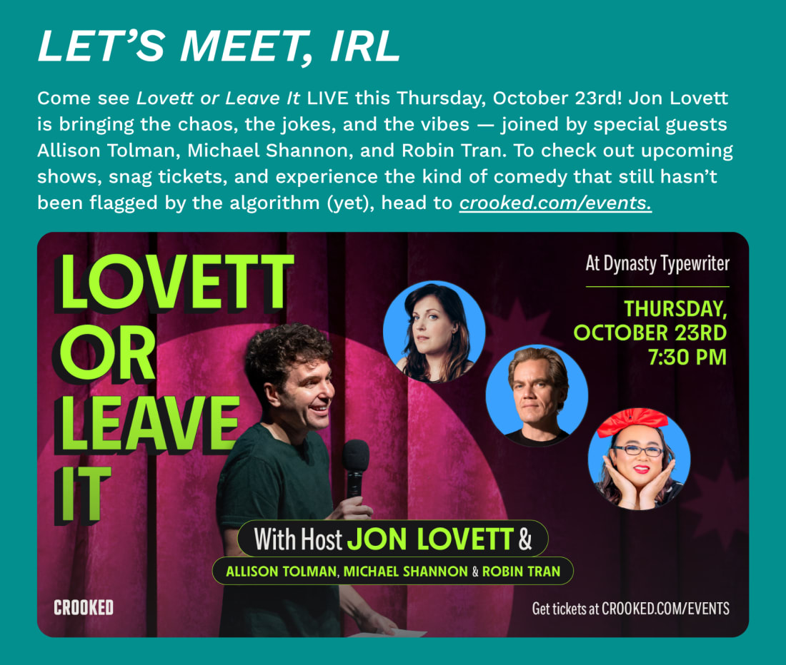 As Crooked’s Jon Favreau tweeted: “Trump WH: Calling us Nazis is violence. Trump nominee: But I’m a Nazi.” FOR THE RECORDDoes it take experience to be a federal prosecutor? Let’s check in with Donald Trump’s hand-picked agent of retribution, Lindsey Halligan, and find out. You know Halligan as the U.S. attorney who’s trying to prosecute New York Attorney General Letitia James on dubious fraud charges. Last weekend, Halligan reached out to a reporter and began texting her about the case on Signal, an encrypted messaging platform. It didn’t go well. Halligan reached out to Anna Bower, a senior editor at Lawfare, with a “heads up” that Bower’s recent reporting on the case was supposedly incorrect. Bower suspected a hoax at first: Senior federal prosecutors don’t drop into reporters’ phones out of nowhere. It simply never happens. But this time, it did. Halligan didn’t specify at the outset that she was speaking “off the record” … so Bower published their entire text thread, lol. Later on, Halligan tried to clean it up — without realizing that responsible reporters don’t operate that way. “By the way — everything I ever sent you is off record,” Halligan wrote, furiously backpedaling. “You’re not a journalist so it’s weird saying that but just letting you know.” Bower responded: “I’m sorry, but that’s not how this works. You don’t get to say that in retrospect.” Bower, of course, is correct — and experienced government officials and lawyers know this. Unless you specify that a conversation is off record before speaking, it can be published. Halligan didn’t seem to know the rules, instead insisting that, “Yes I do” have the power to declare past statements “Off record.” Sigh. WHAT ELSE?Donald Trump is demanding that the Department of Justice pay him $230 million to make up for the federal investigations into him, according to the New York Times. “The situation has no parallel in American history,” the outlet writes. “It is also the starkest example yet of potential ethical conflicts created by installing the president’s former lawyers atop the Justice Department.” So he’s just… demanding a quarter-billion bucks from the government? Okay. Wow! Trump claimed that countries in the Middle East have offered to enter the Gaza Strip and “straighten out Hamas” if the group continues to “act badly” during the ceasefire. “There is still hope that Hamas will do what is right. If they do not, an end to Hamas will be FAST, FURIOUS, & BRUTAL!” Trump wrote on social media. More than one-third of new ICE recruits have failed the agency’s fitness test, which includes doing 15 push-ups and 32 sit-ups, and running 1.5 miles within 14 minutes. “A considerable amount of athletically allergic candidates” had “misrepresented” their physical fitness on application forms, according to an email from ICE headquarters to top officials this month. I happen to have an “athletic allergy” that really kicks in on Sunday afternoons, so I can relate. North Carolina lawmakers approved redrawing the state’s congressional map, which would likely result in an extra House seat for Republicans. “President Trump has called on Republican-controlled states across the country to redraw congressional districts. This map answers that call,” said Republican State Sen. Ralph Hise. This is not how democracy works! Democratic Maine Senate candidate Graham Platner is coming under fire after revealing that he has a skull and crossbones tattoo on his chest, which some say looks like the Nazi-linked Totenkopf symbol. While in the Marines in 2006, “we got very inebriated, and we did what Marines on liberty do, and we decided to go get a tattoo… I am not a secret Nazi,” Platner told Crooked’s Tommy Vietor on Pod Save America. Platner once described himself on Reddit as a “communist.” Top Trump officials from multiple agencies are working together to target Trump’s political enemies, in a group known as the “Interagency Weaponization Working Group.” Trump is still salty about his two impeachments, his felony prosecutions, and the investigation into Russia meddling with the 2016 election. The group’s mission is “basically to go after ‘the Deep State,’” one source told Reuters. Then again, we all know how office “committees” work. They’ll probably start by planning a totally kick-ass year-end office party, and then get distracted. Hopefully! Is Trump’s famous bromance with Russian dictator Vladimir Putin on the rocks… again? A White House official told Politico that the planned meeting between Trump and Putin in Budapest isn’t happening anymore, seemingly because Russia refuses to budge on its conditions for a ceasefire with Ukraine. The drama! Extra extra! The White House responded to my request for comment about Trump’s online trolling yesterday. “The Obama Pod Bros are now writing about our banger memes and hilarious dunks, so what do you think it says about our strategy?” White House spokesperson Abigail Jackson said in a statement. Very classy! Light at the End of the Email…The population of one of the world’s rarest sea giants, the North Atlantic right whale, is gradually recovering. Scientists estimate that there are 384 of the whales in existence, eight more than last year. That continues a steady 7 percent population growth since 2020, largely thanks to conservation efforts. Why do kids keep saying “6-7”? The viral trend confounds older folks and makes Gen Z and Gen Alpha crack up. But what do the numbers even mean? Nothing… and that’s the point. “It’s really dumb, but it’s really beautiful because it’s dumb,” one content creator said. I’m 26 years old and was so confused when I heard it, which is when I realized that even I’m unc. Speaking of the youth, Gen Z workers are taking more control at their workplaces — by acting like emergencies aren’t actu