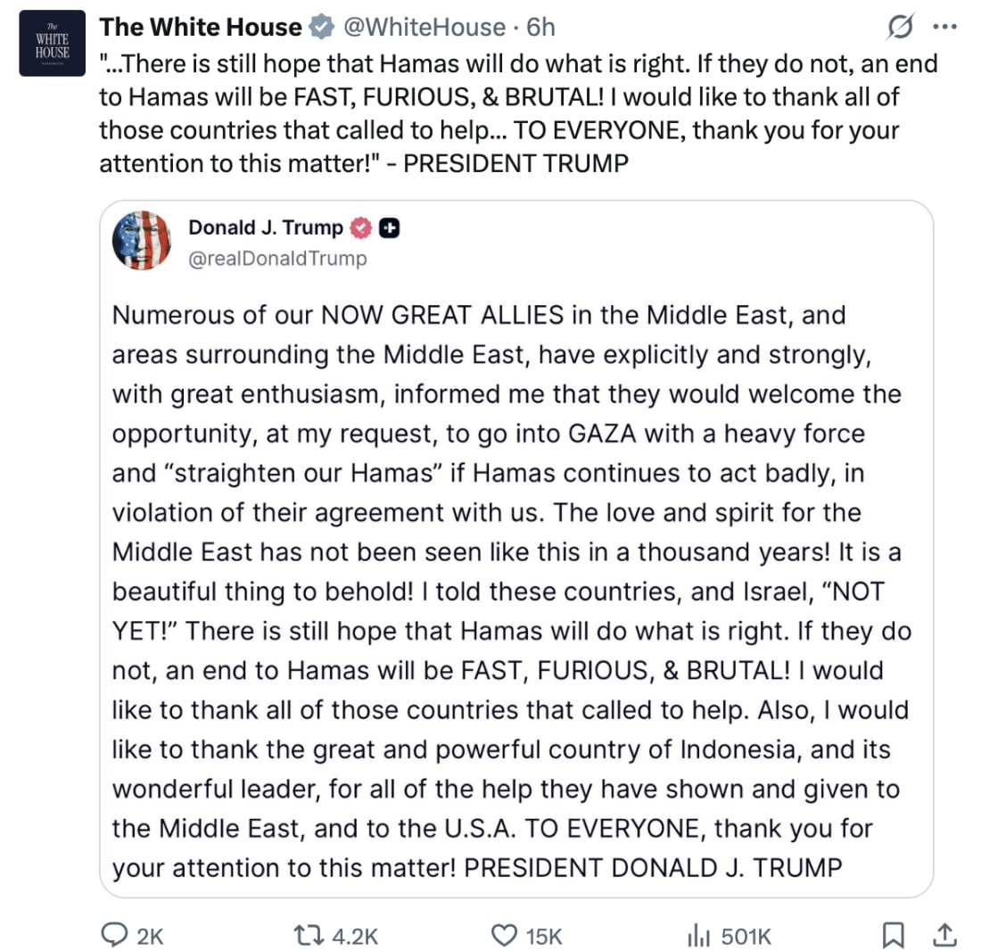 Trump took to Truth Social Tuesday in an urge for Hamas to do “what is right” to ensure the peace deal endures, but with the force of a “FAST, FURIOUS, & BRUTAL” end with the help of Middle East Allies if not compliant.